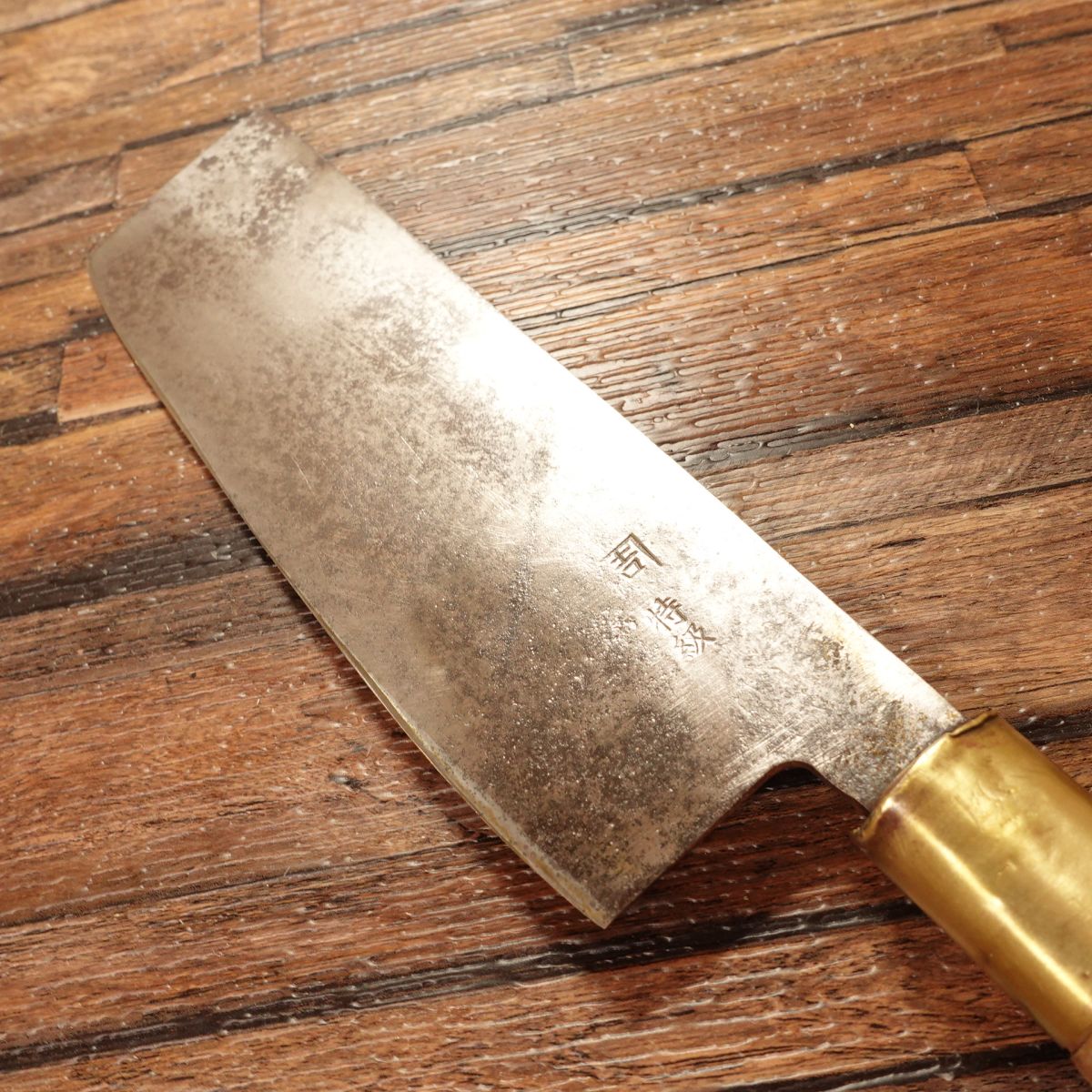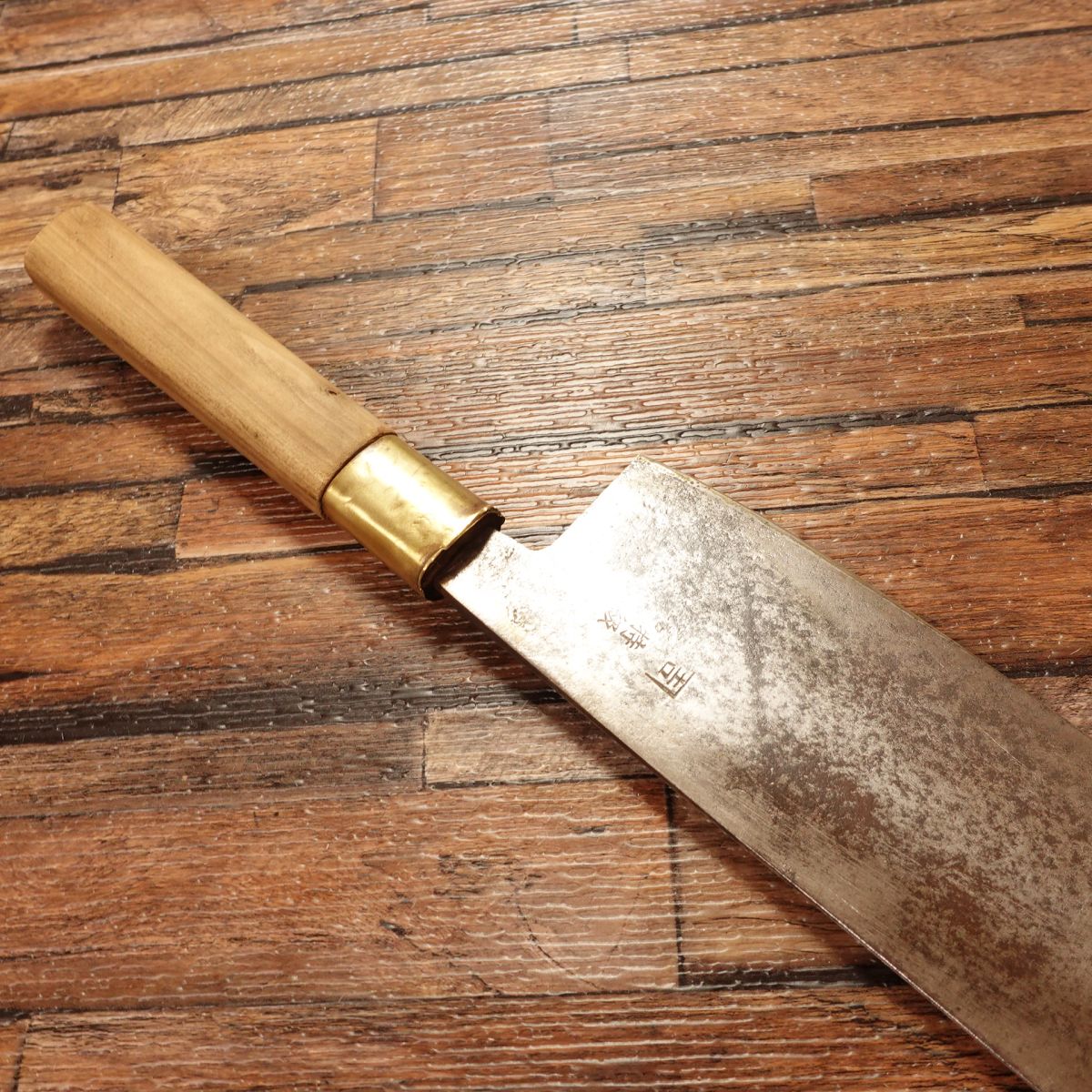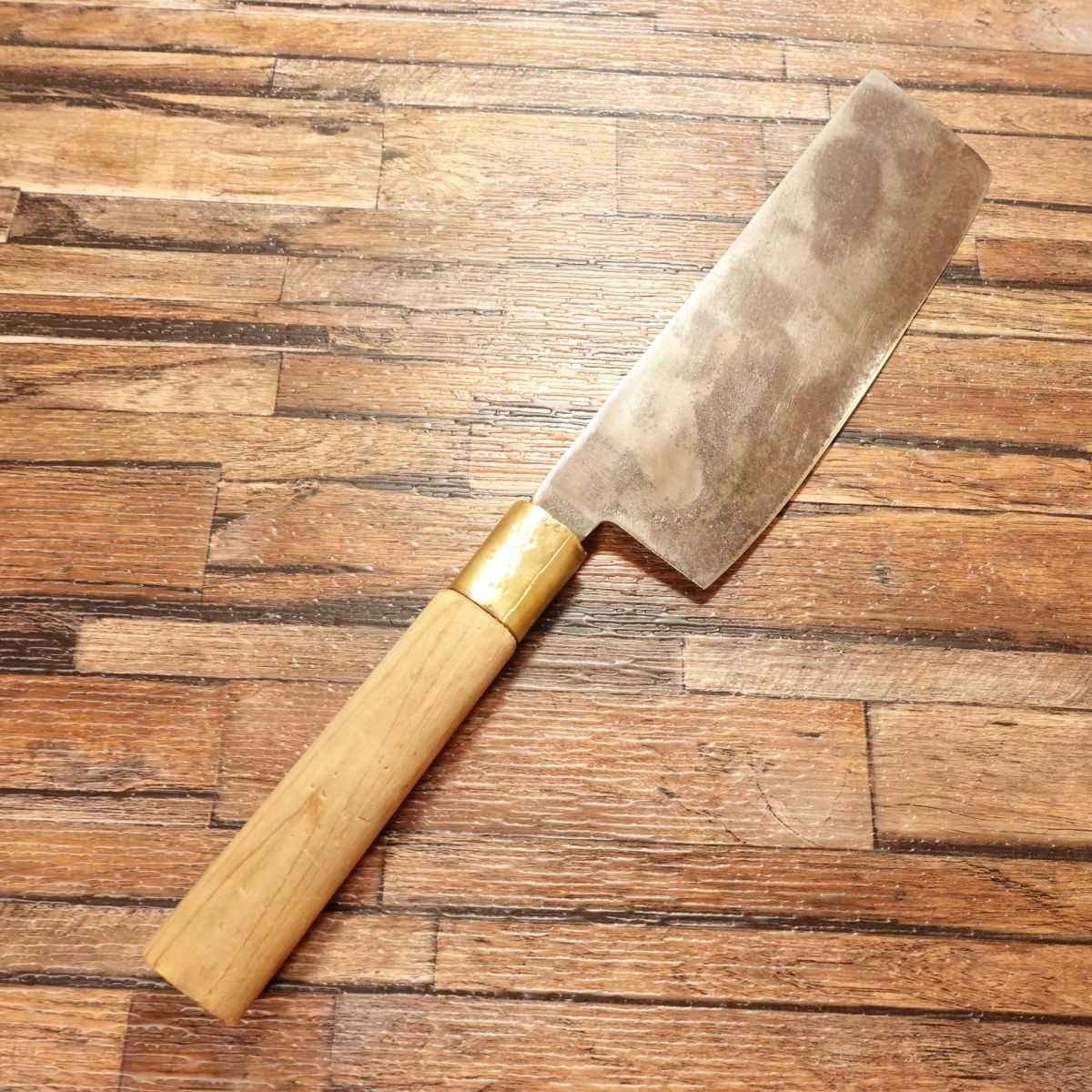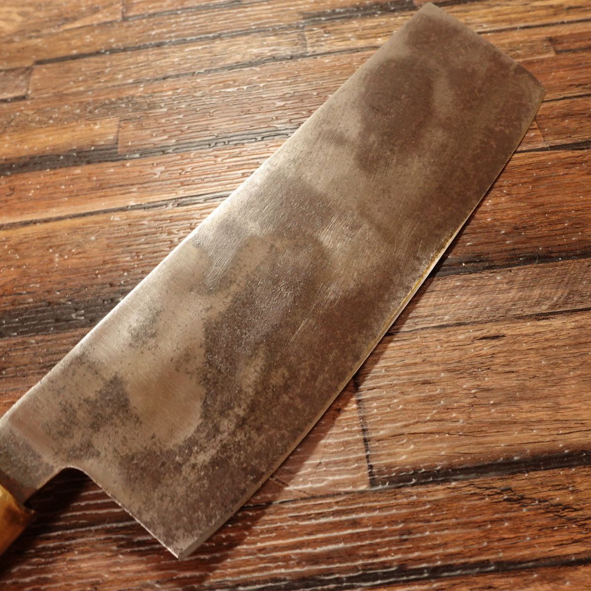 The Nakiri is a Japanese vegetable knife known for its straight blade, ideal for making clean cuts through vegetables. This piece shows a natural patina typical of high-carbon steel, while the cutting edge maintains a clean silver hue. The blade is thin, with a spine thickness of around 4mm near the heel, tapering to less than 1mm at the tip, offering excellent control and precision.