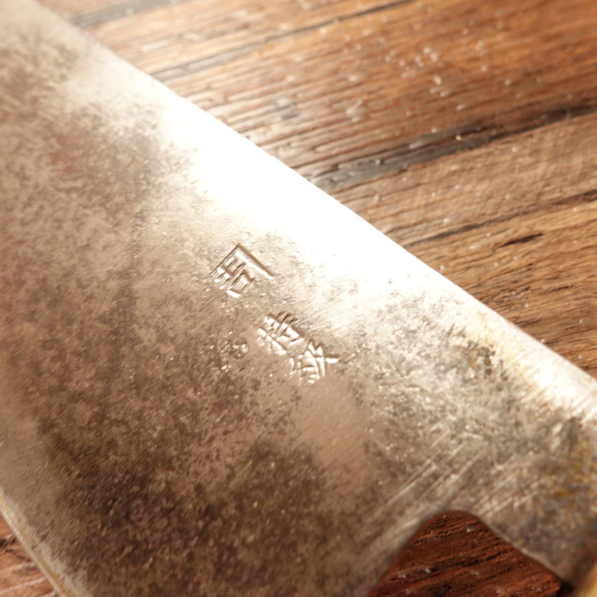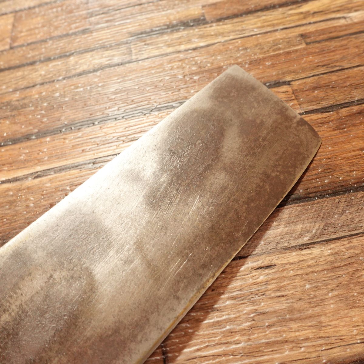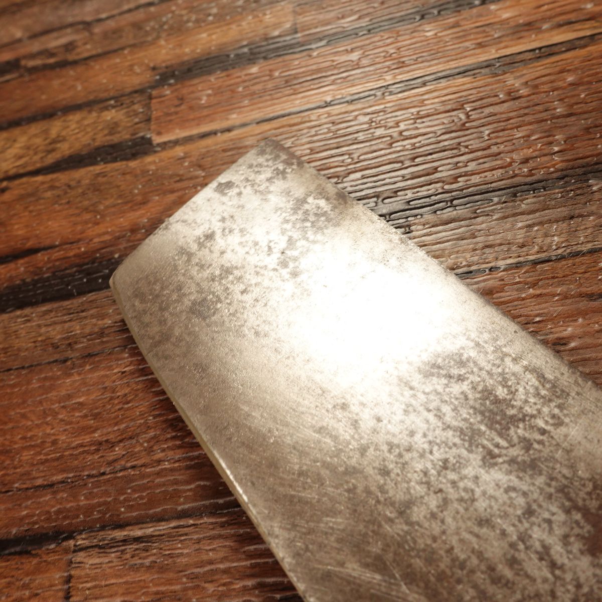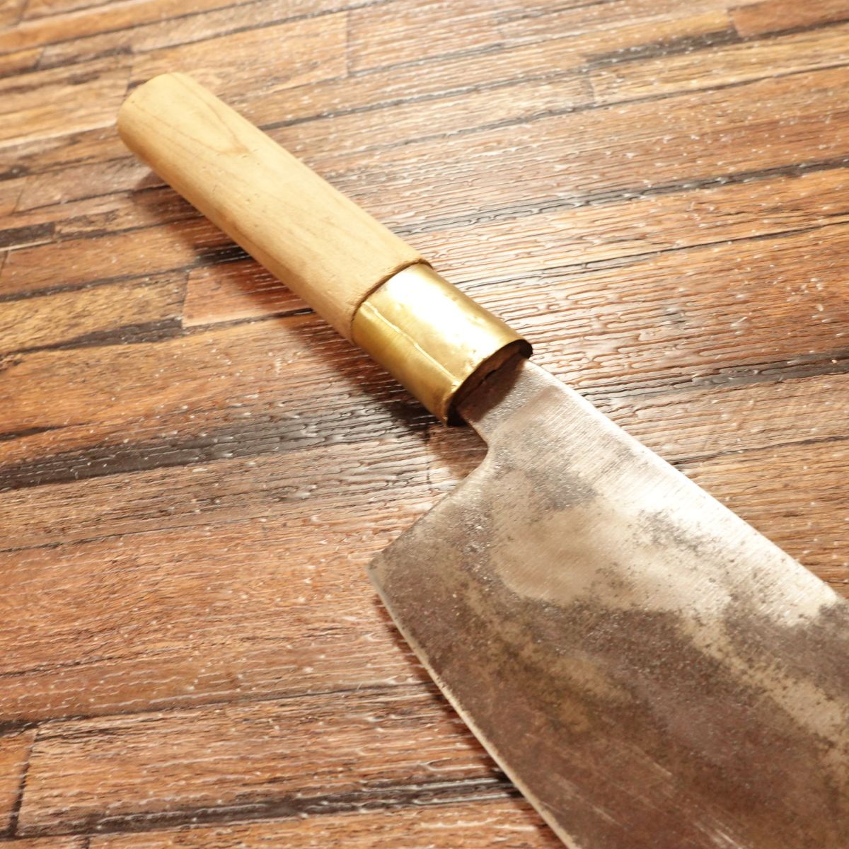 The Nakiri is a Japanese vegetable knife known for its straight blade, ideal for making clean cuts through vegetables. This piece shows a natural patina typical of high-carbon steel, while the cutting edge maintains a clean silver hue. The blade is thin, with a spine thickness of around 4mm near the heel, tapering to less than 1mm at the tip, offering excellent control and precision.