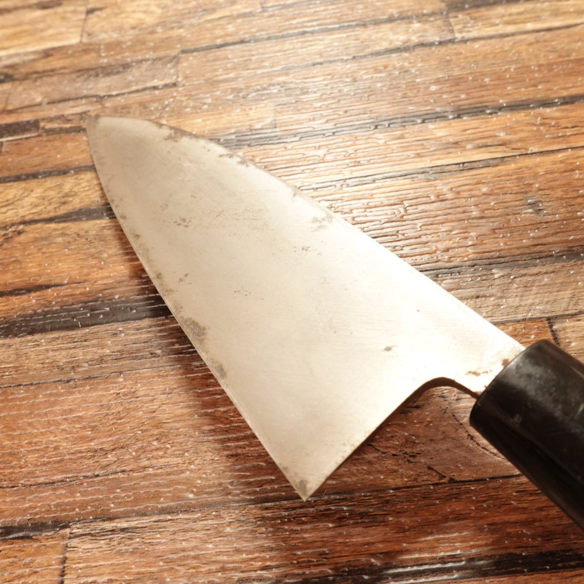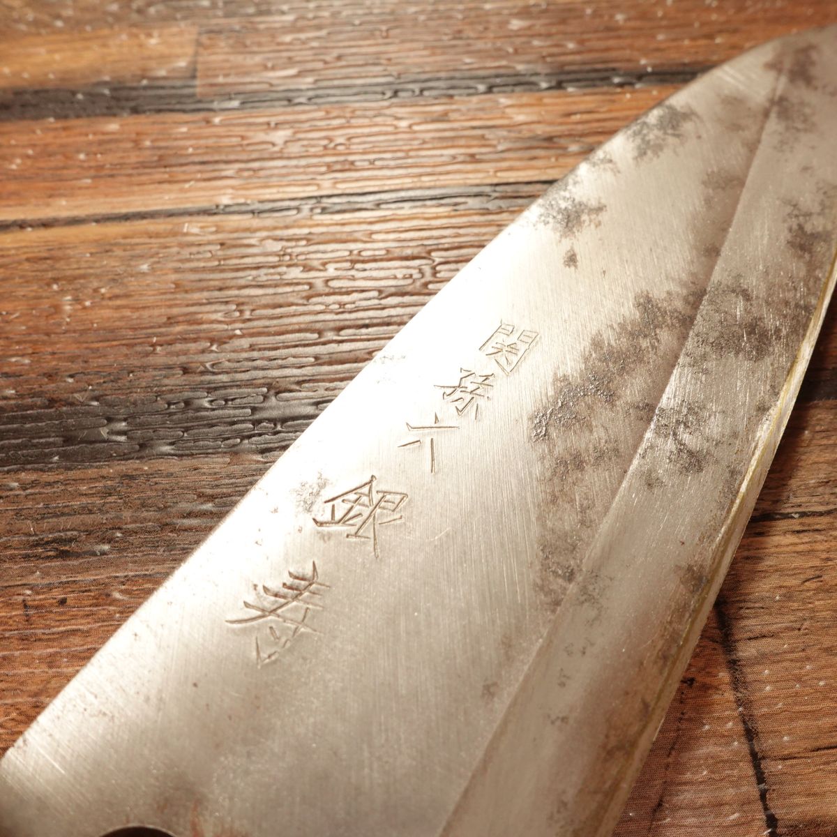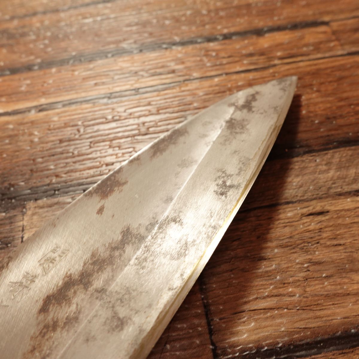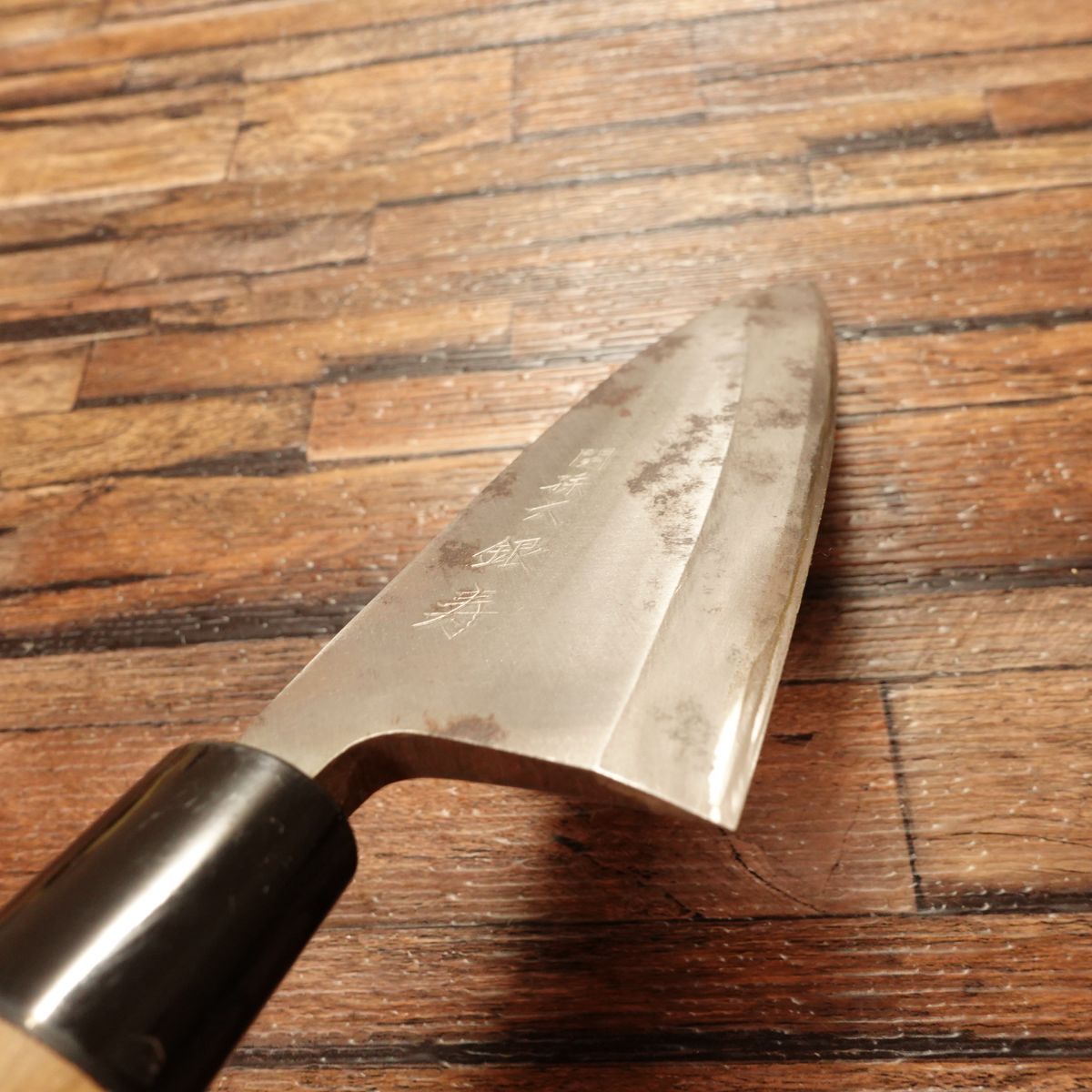 The Deba is a heavy, single-bevel knife designed for cutting through fish and bone. This one is from the renowned Seki Magoroku line by Kai Corporation. While it shows some natural patina from storage, the cutting edge remains bright and clean.
