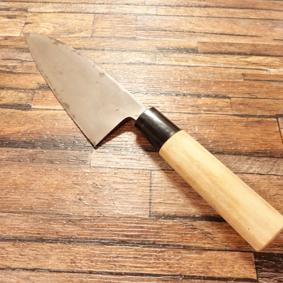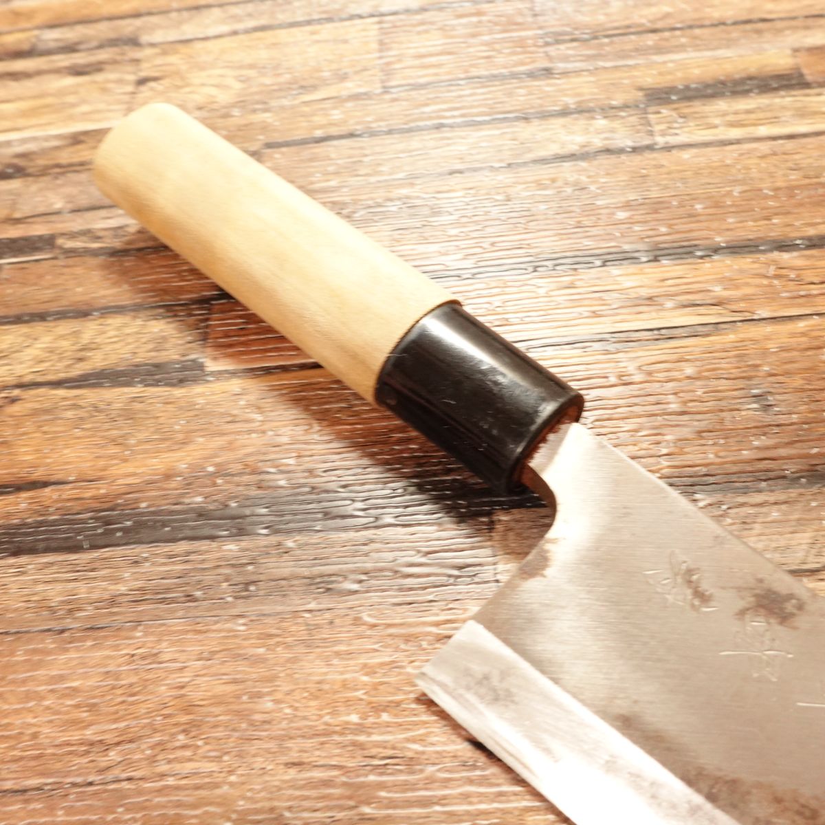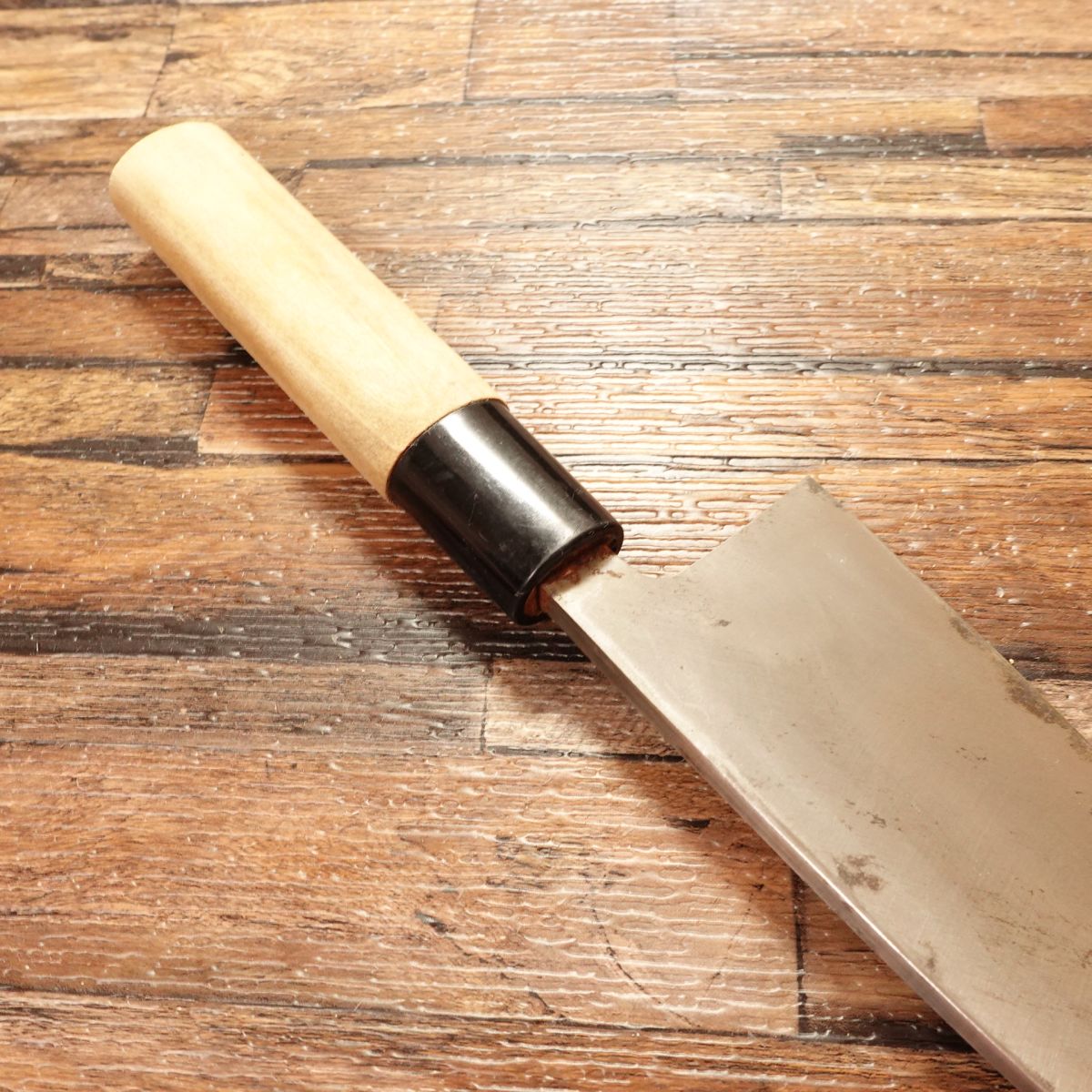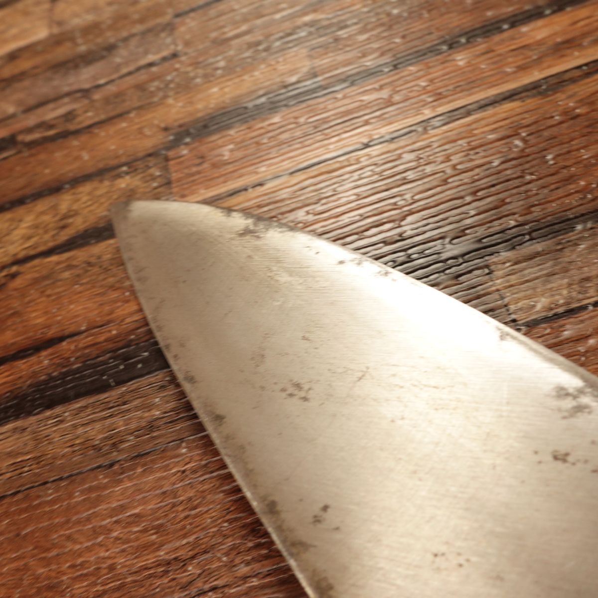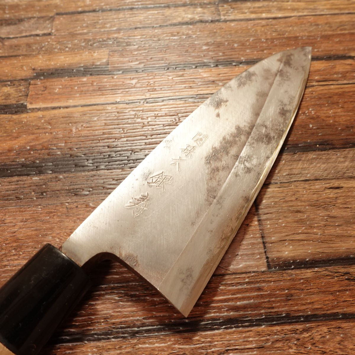 The Deba is a heavy, single-bevel knife designed for cutting through fish and bone. This one is from the renowned Seki Magoroku line by Kai Corporation. While it shows some natural patina from storage, the cutting edge remains bright and clean.
