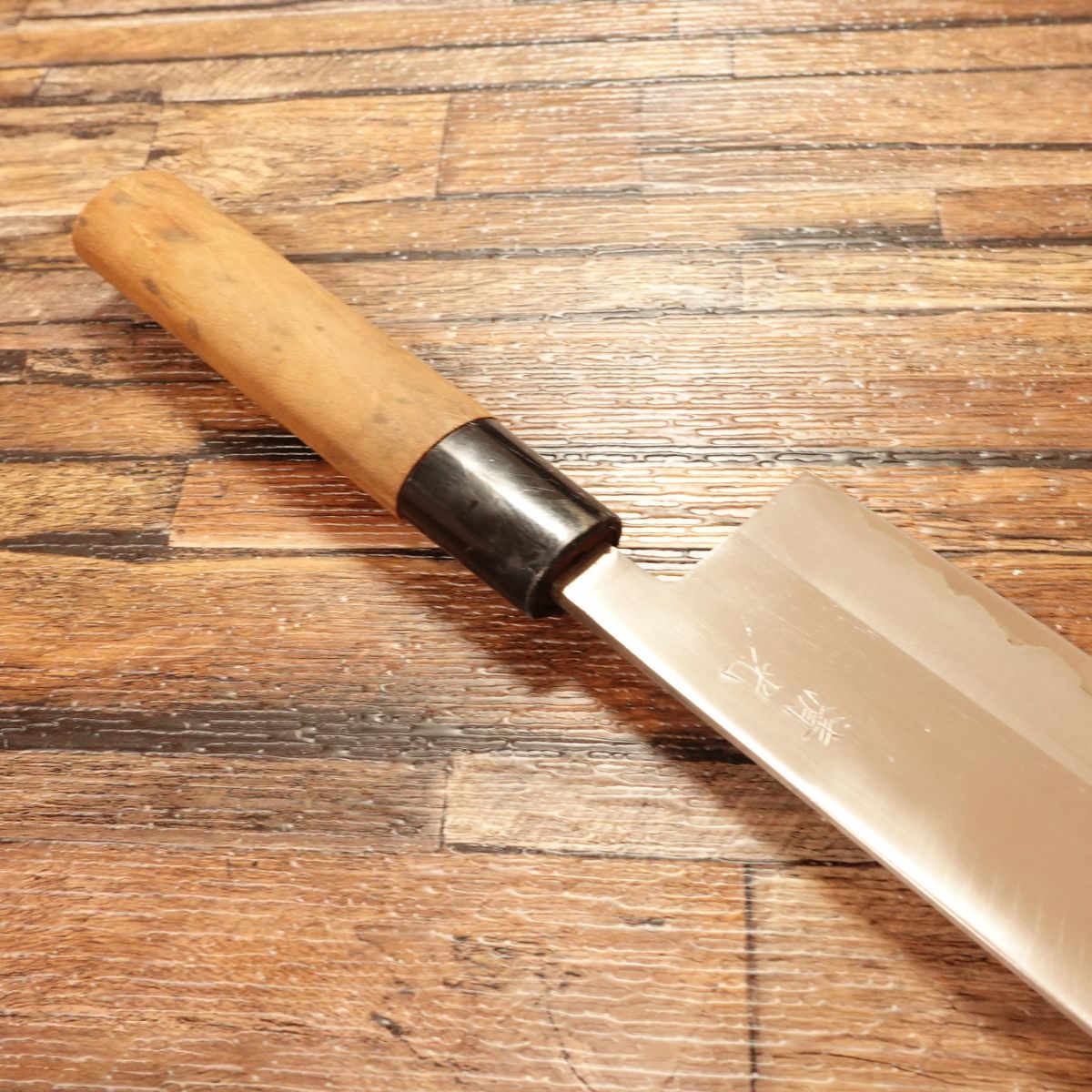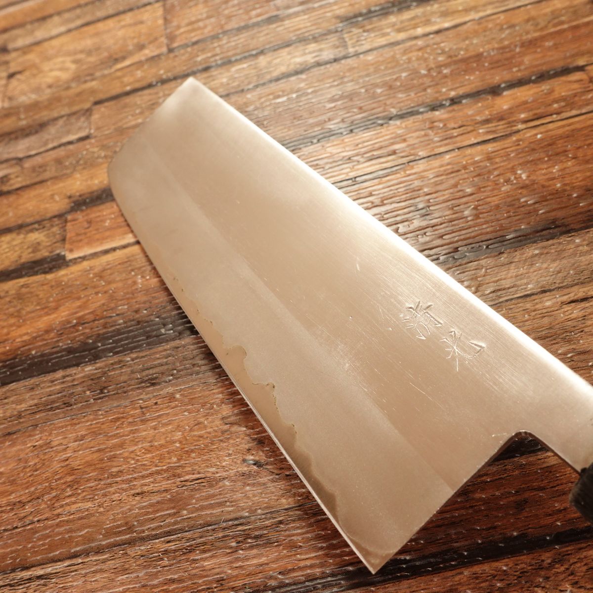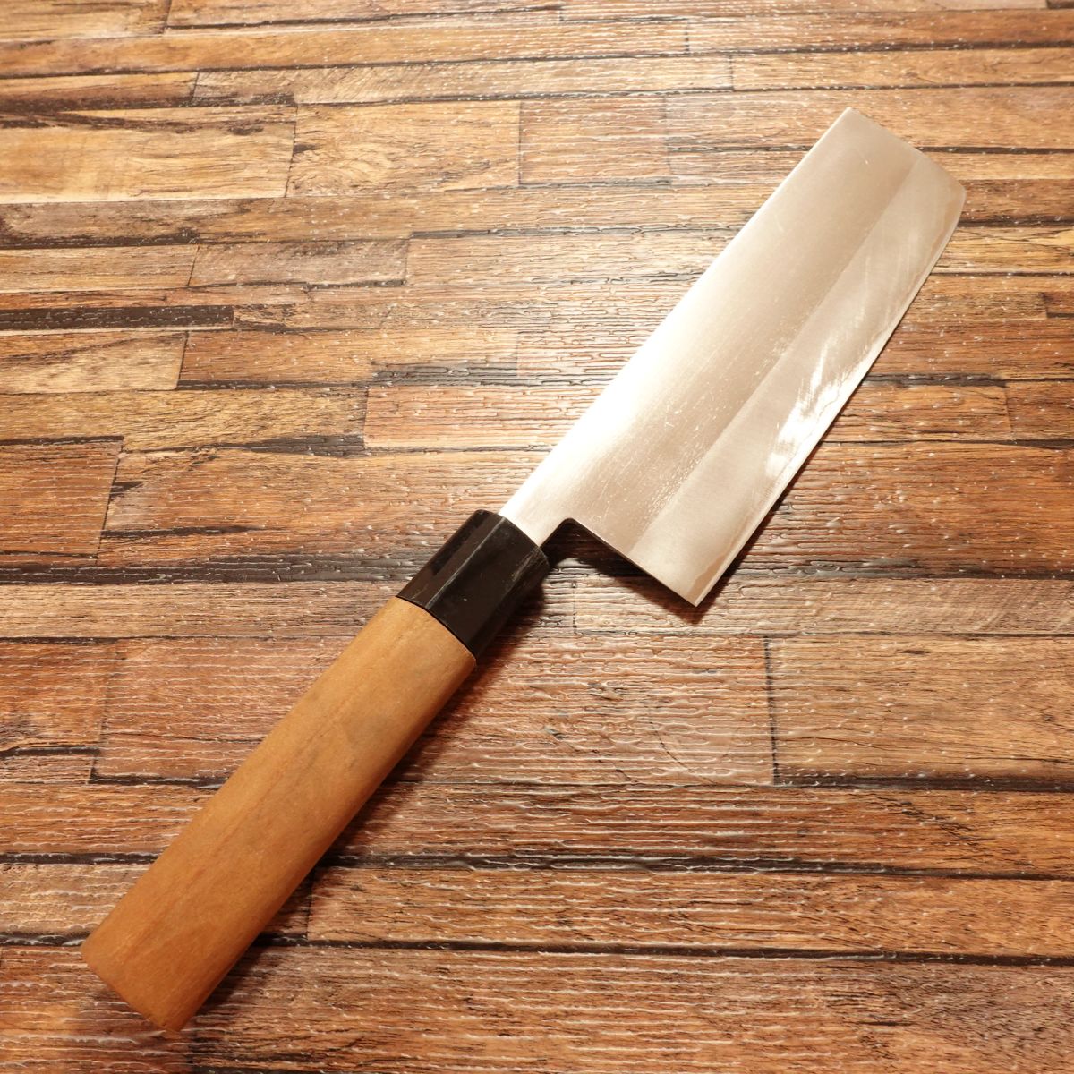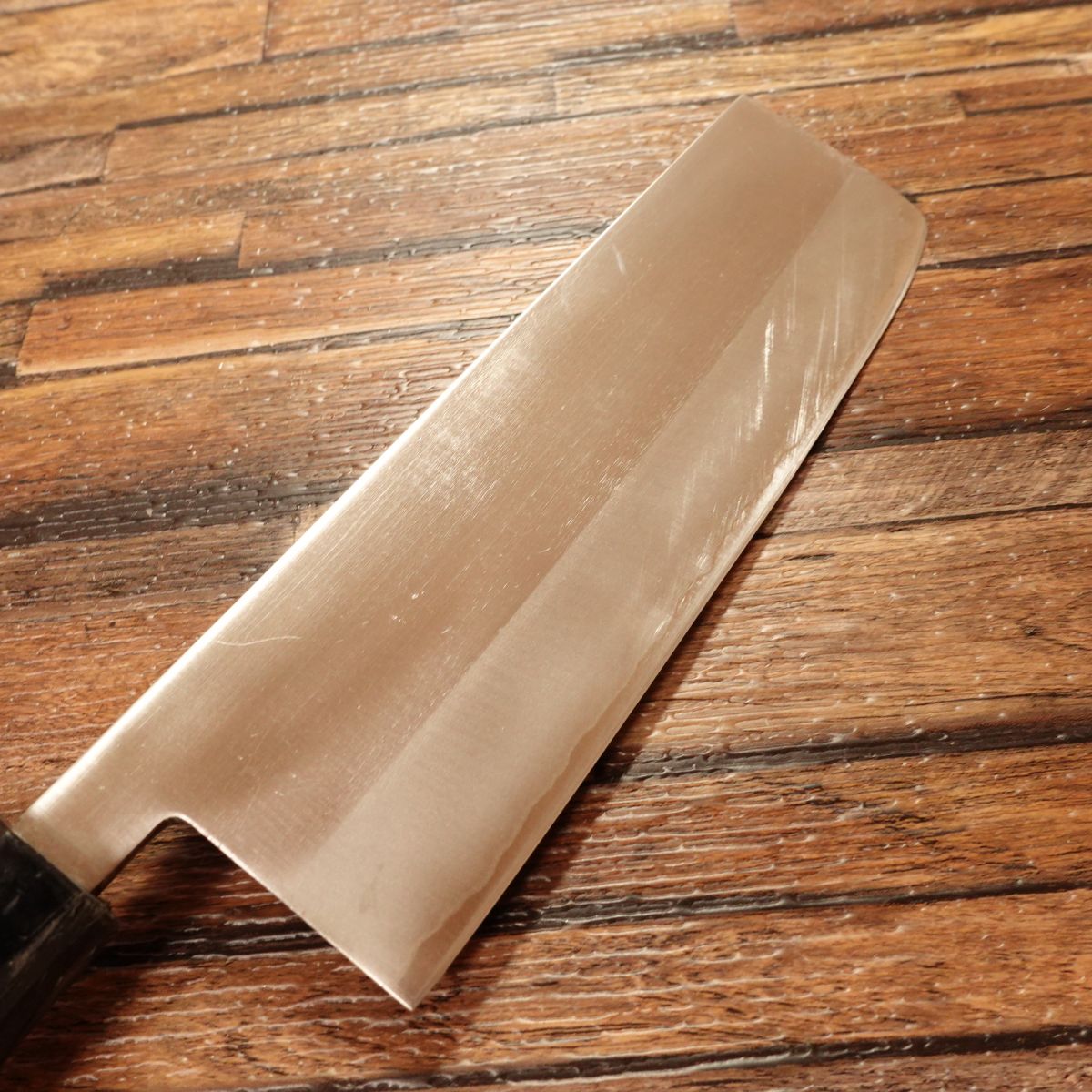 The Nakiri is a Japanese vegetable knife prized for its ability to make straight, clean cuts. This double-edged laminated steel blade is easy to handle and maintain. It appears almost unused, though the handle shows minor marks, with light storage scratches or honing marks present.