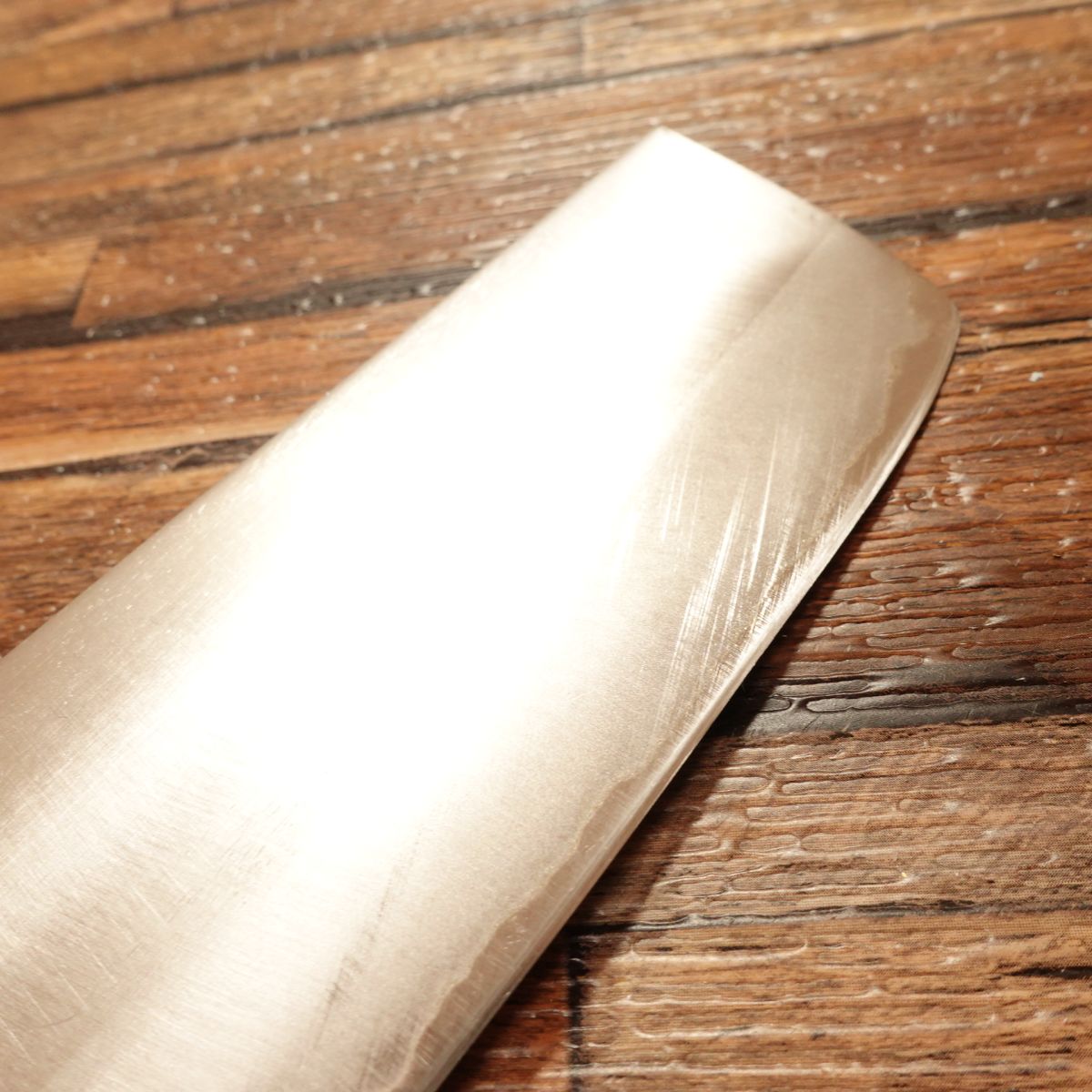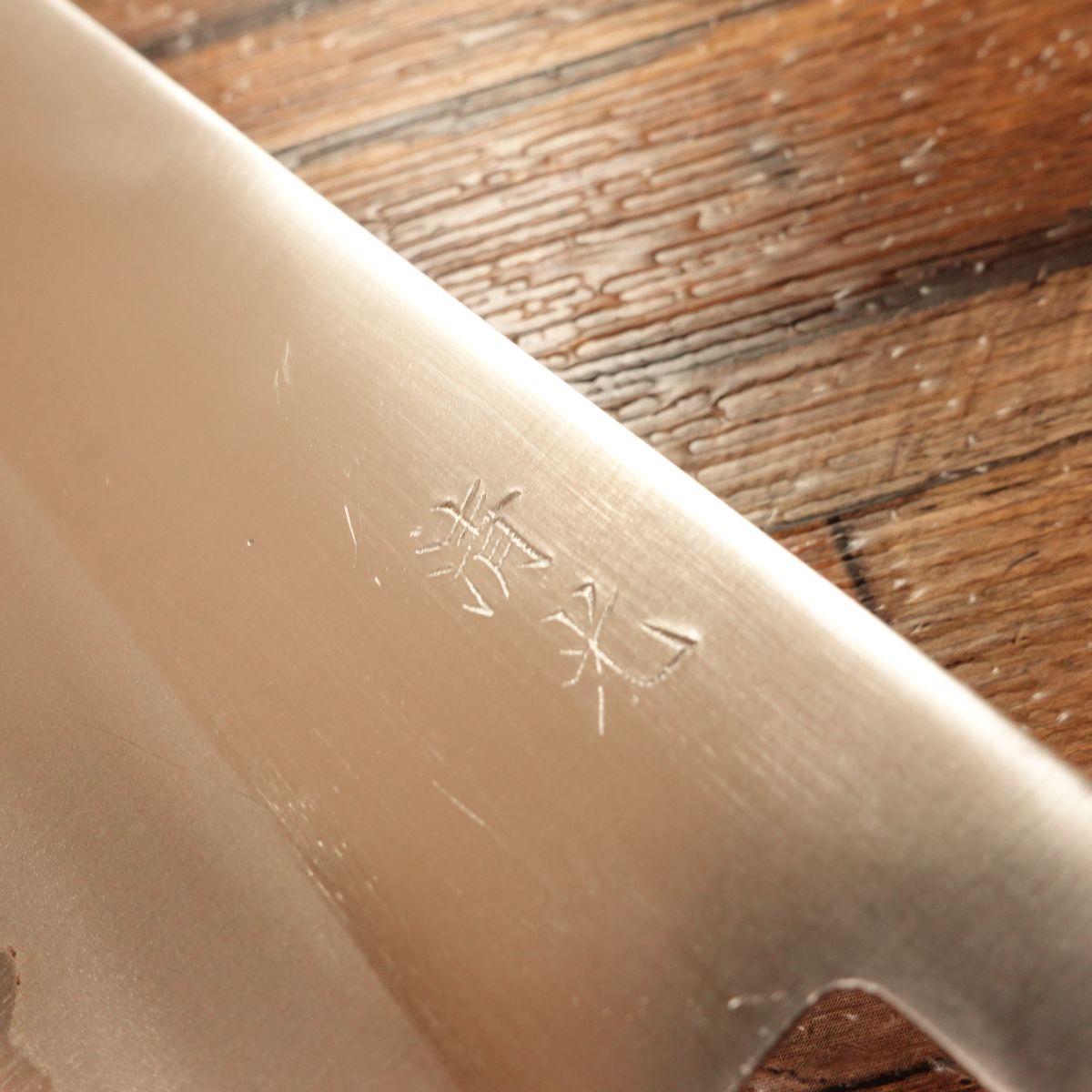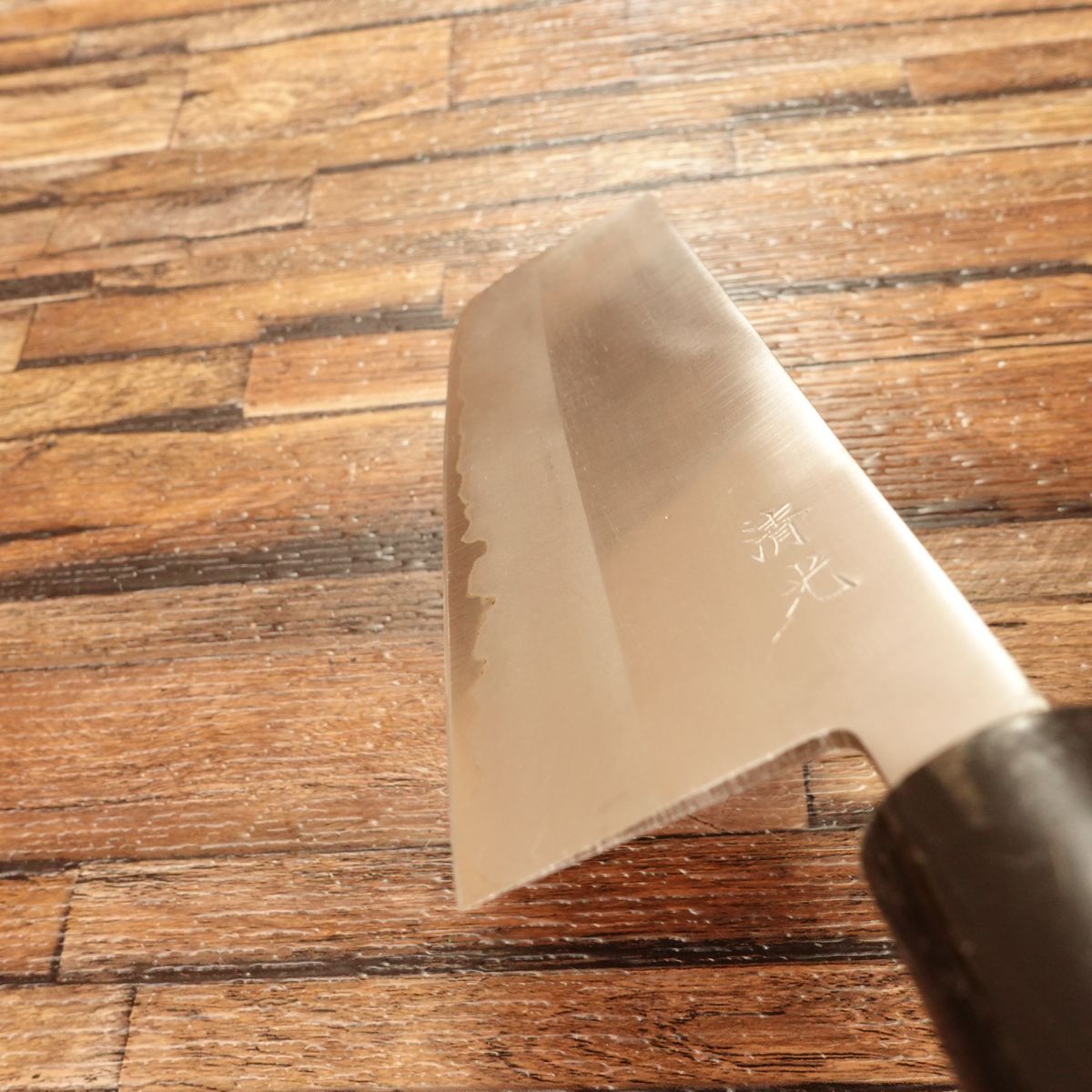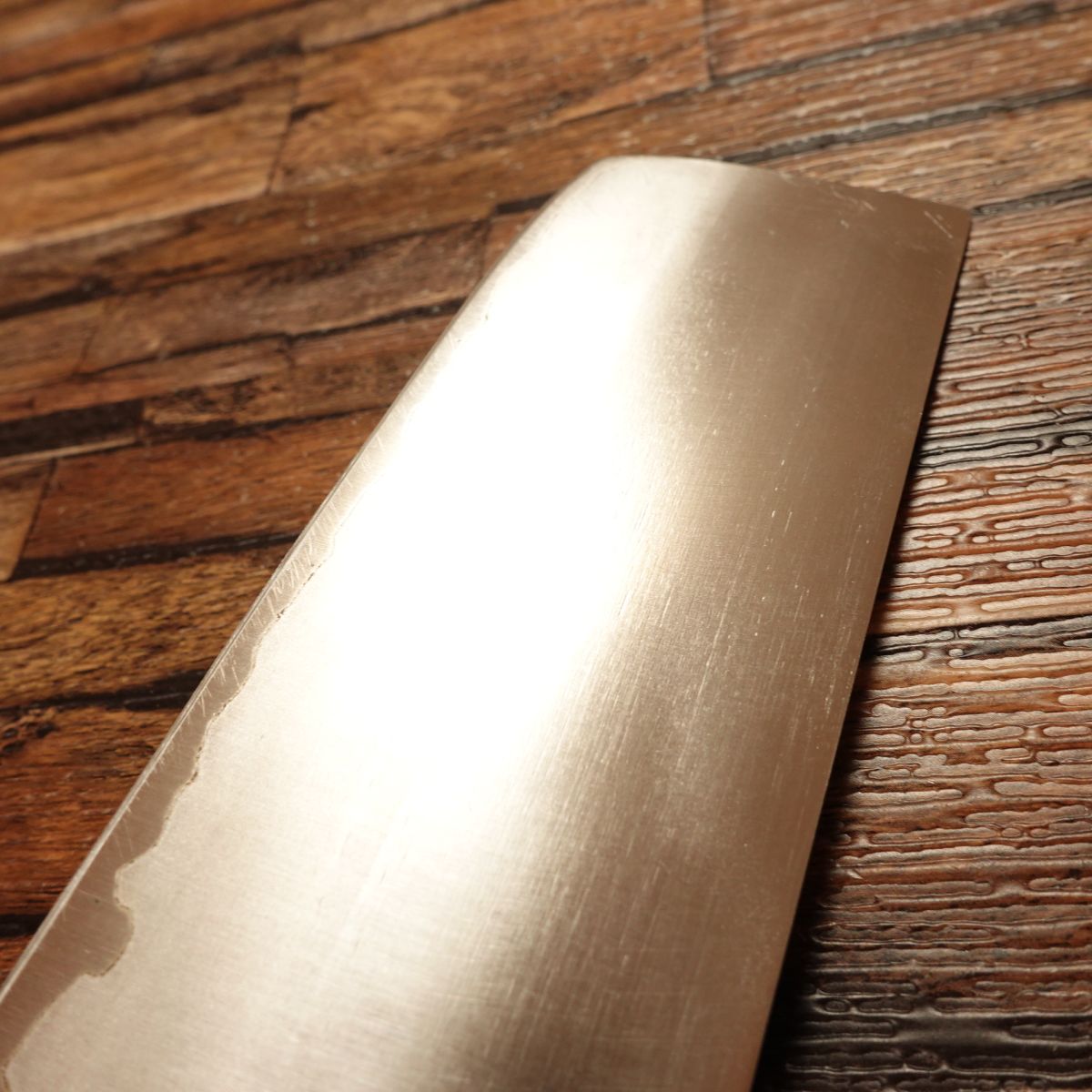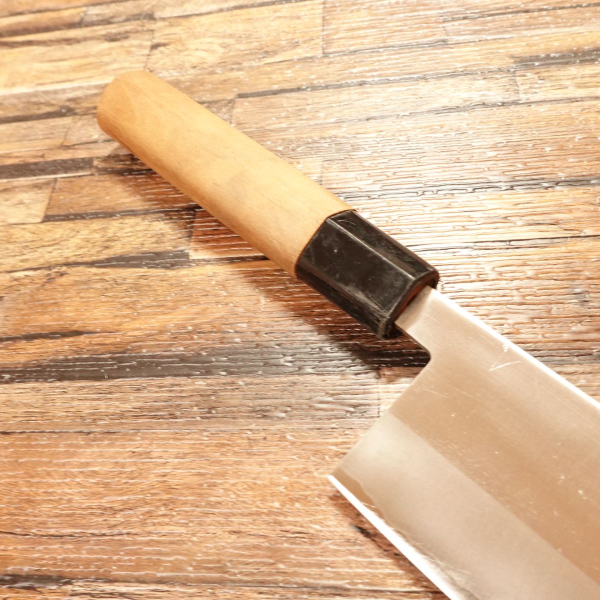 The Nakiri is a Japanese vegetable knife prized for its ability to make straight, clean cuts. This double-edged laminated steel blade is easy to handle and maintain. It appears almost unused, though the handle shows minor marks, with light storage scratches or honing marks present.