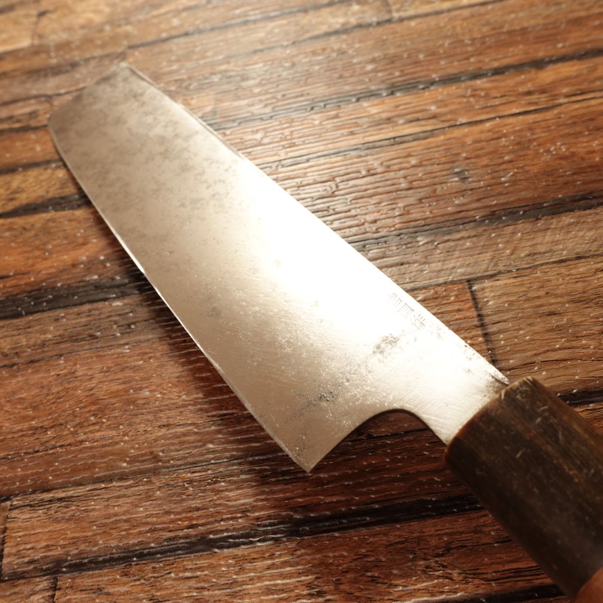 Hagane high-carbon steel, traditional finish with minimal patina from storage; the fresh edge is bright silver.