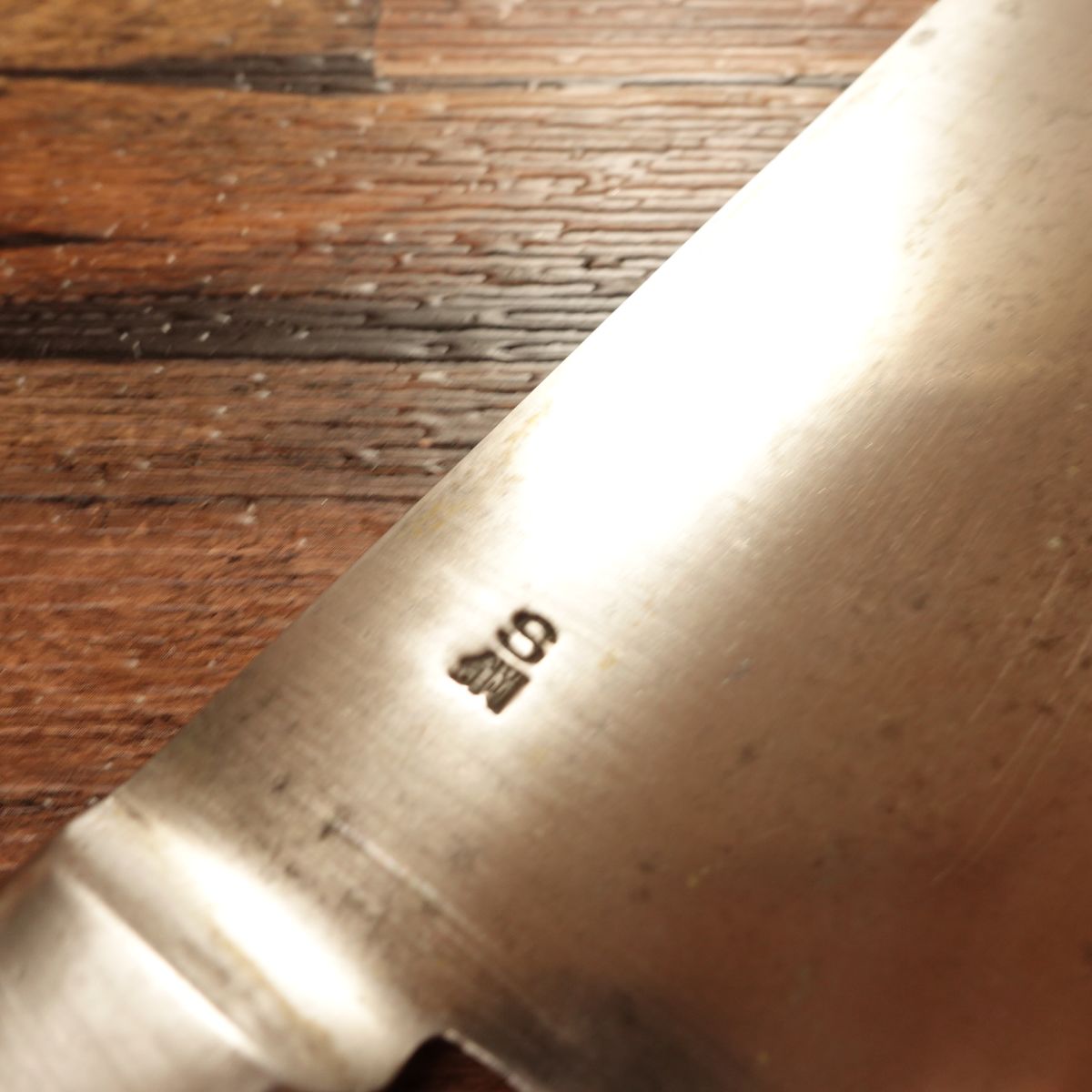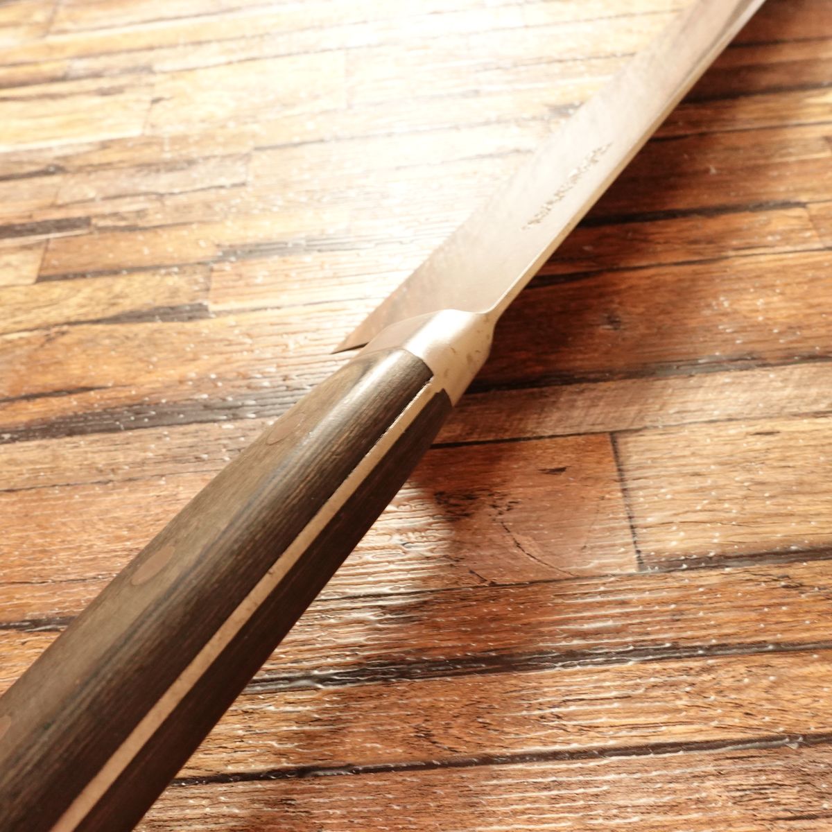 A long chef’s knife suited to large prep. “S-steel” hagane core provides firm edge feel and durability.