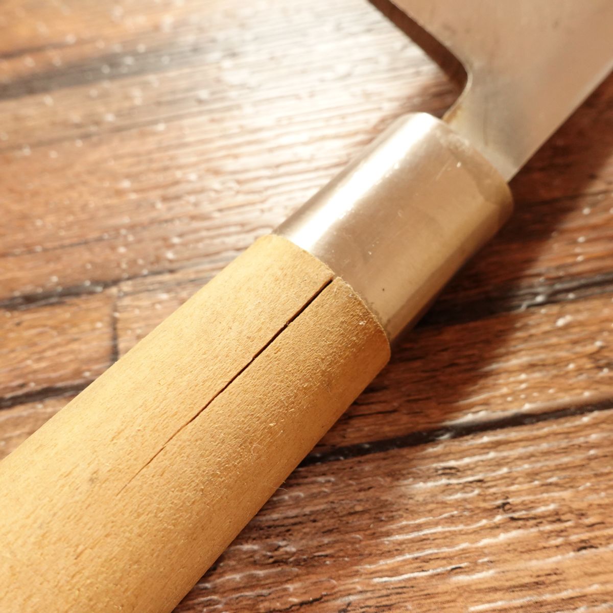 The Deba is a traditional Japanese knife specialized for filleting fish, with its thick and durable blade. This piece shows minimal signs of use, though there’s a small crack on the handle from storage, which does not affect usability and is reflected in the price. Made from single-edged high-carbon steel, it delivers excellent sharpness.