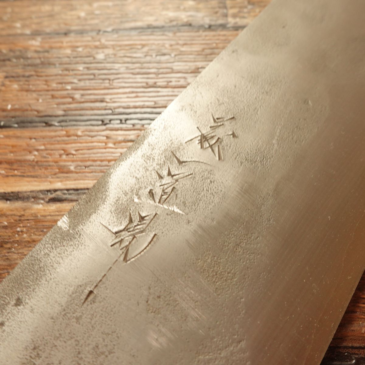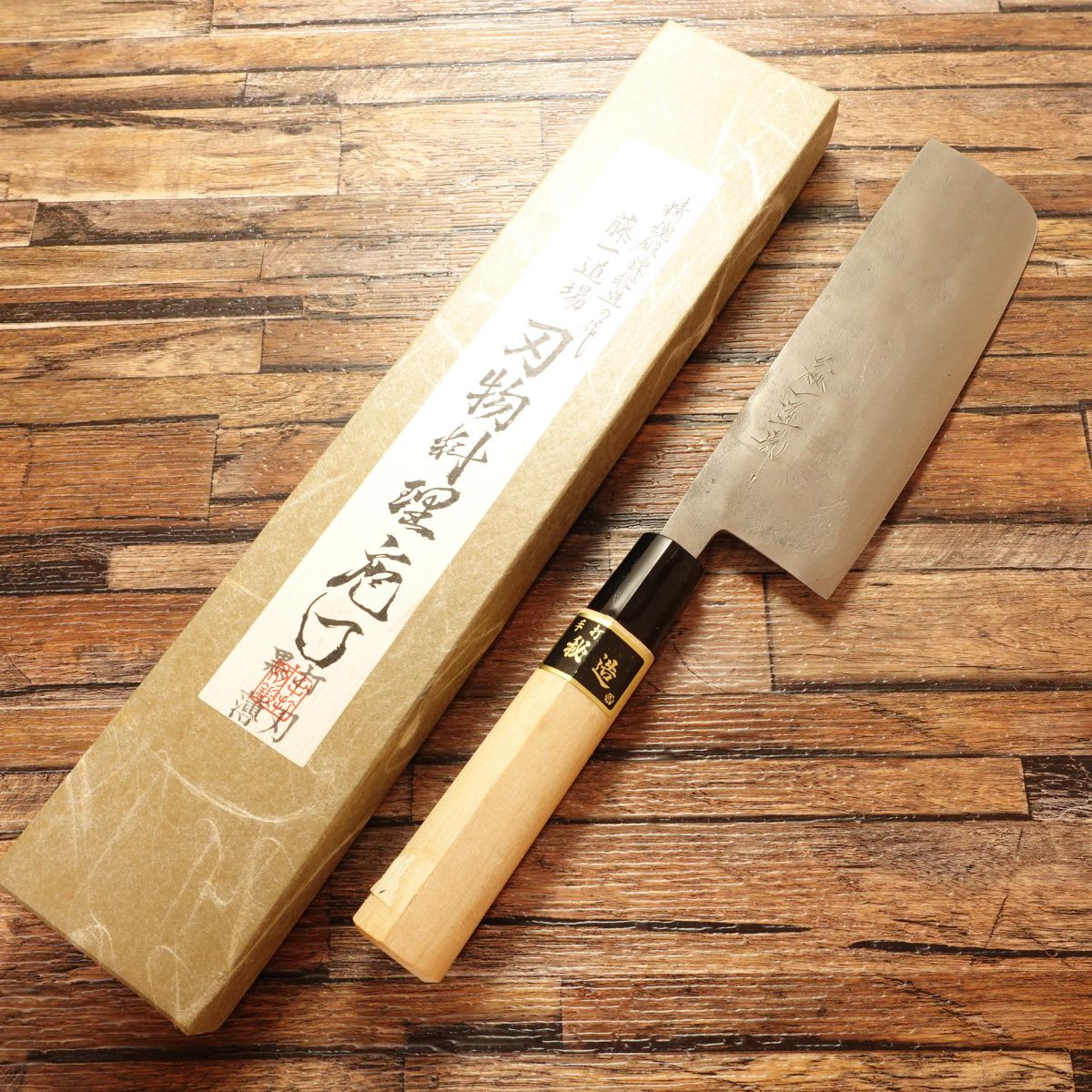 The Nakiri is a Japanese vegetable knife with a straight edge, perfect for clean cuts. Though labeled "black-forged," the blade instead shows a beautiful pear-skin and hammered pattern. This unused knife has been lightly sharpened and honed for optimal performance.