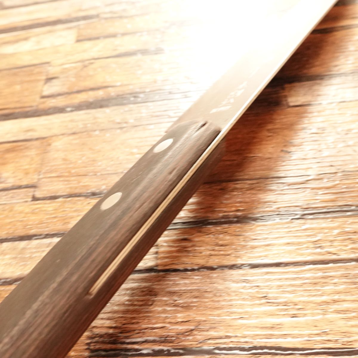 A versatile Santoku built with honwarikomi construction and DP treatment—hard steel at the core with more stainless cladding for easier upkeep.