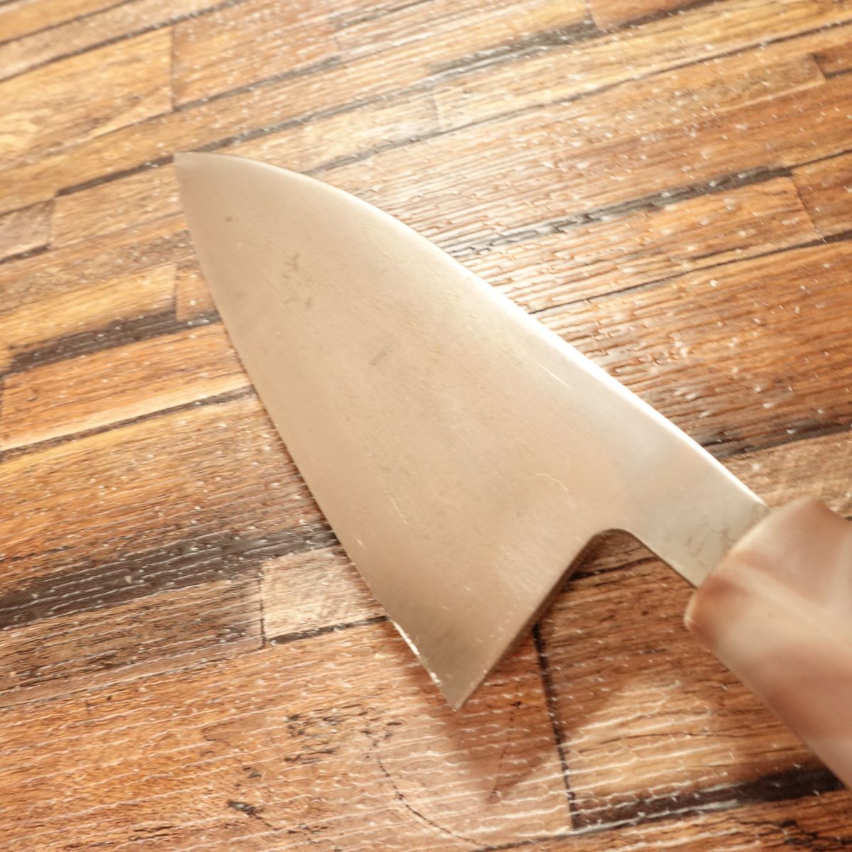 The Deba is a sturdy traditional Japanese knife designed for filleting fish. This is an "Ai-Deba," a lighter and more maneuverable variant of the standard Deba. Made from single-edged high-carbon steel, it offers exceptional sharpness. The blade is clean with only minor patina from storage and shows little sign of use.
