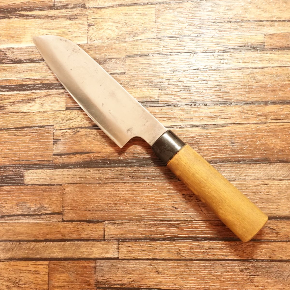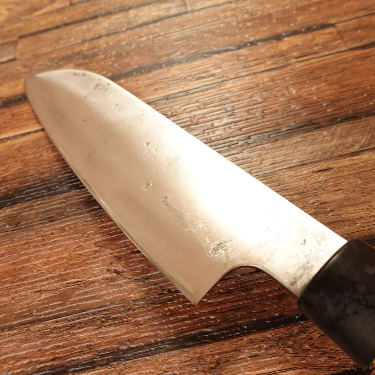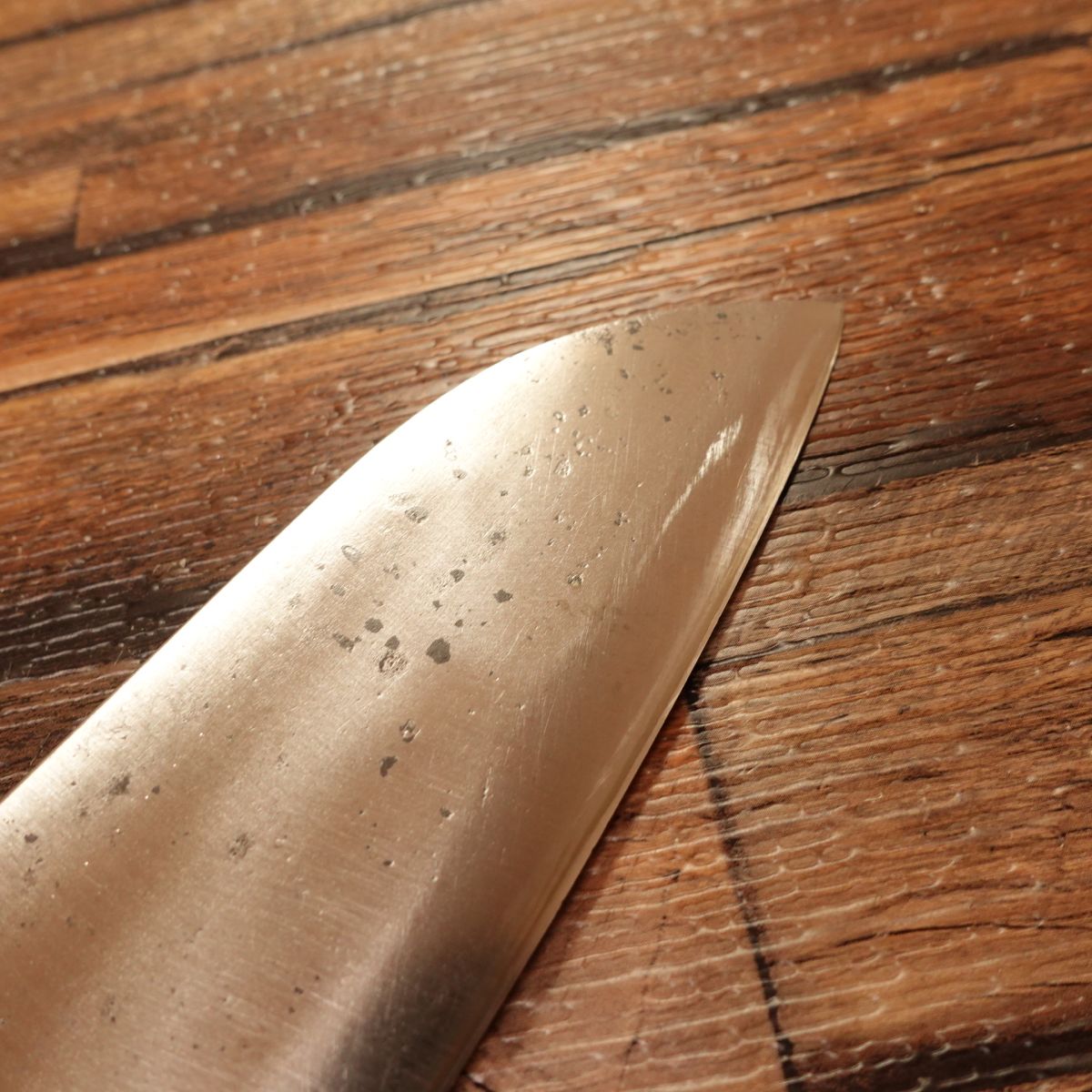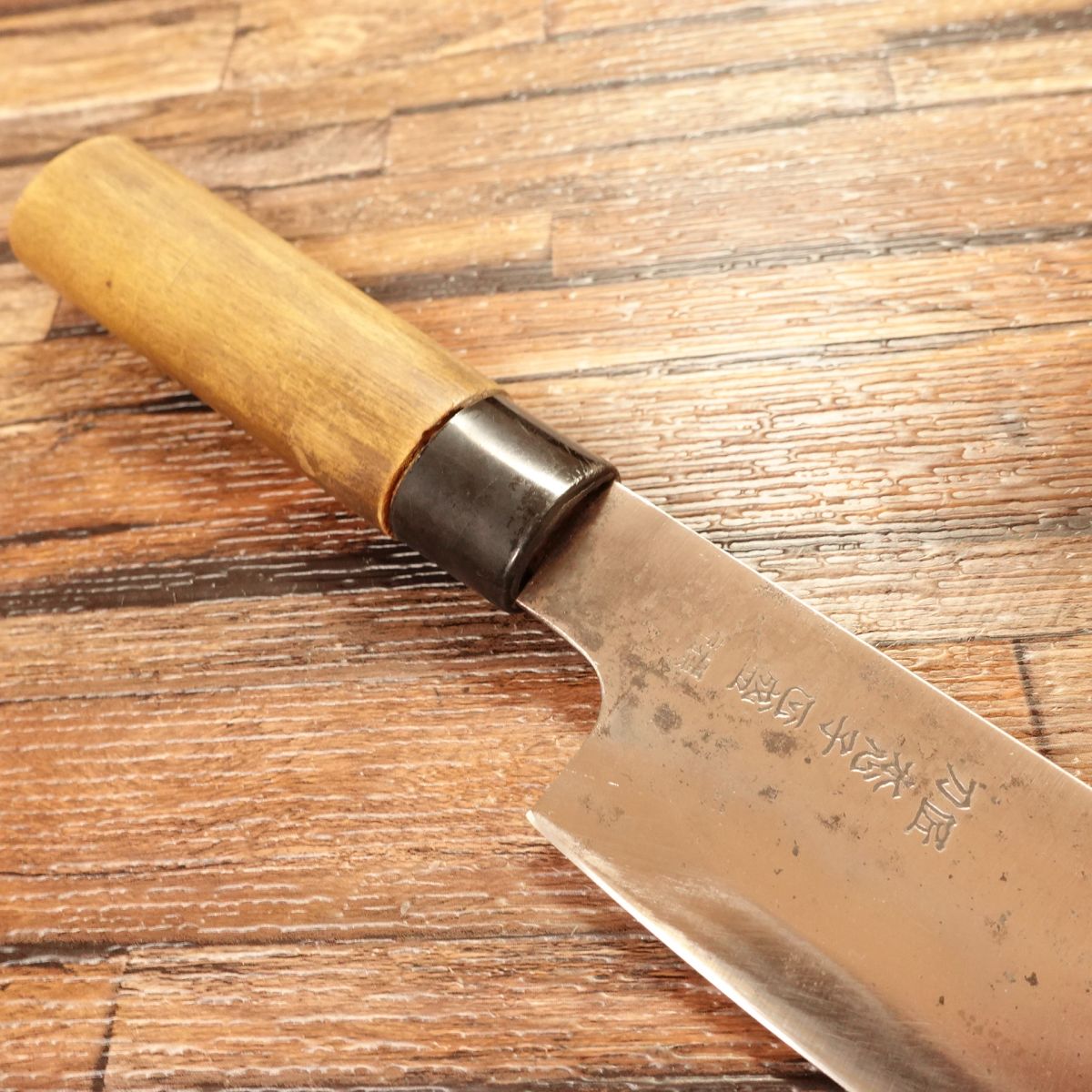 All-purpose Santoku in hagane, showing slight patina typical of carbon steel but a clean, bright edge. Traditional forged feel.