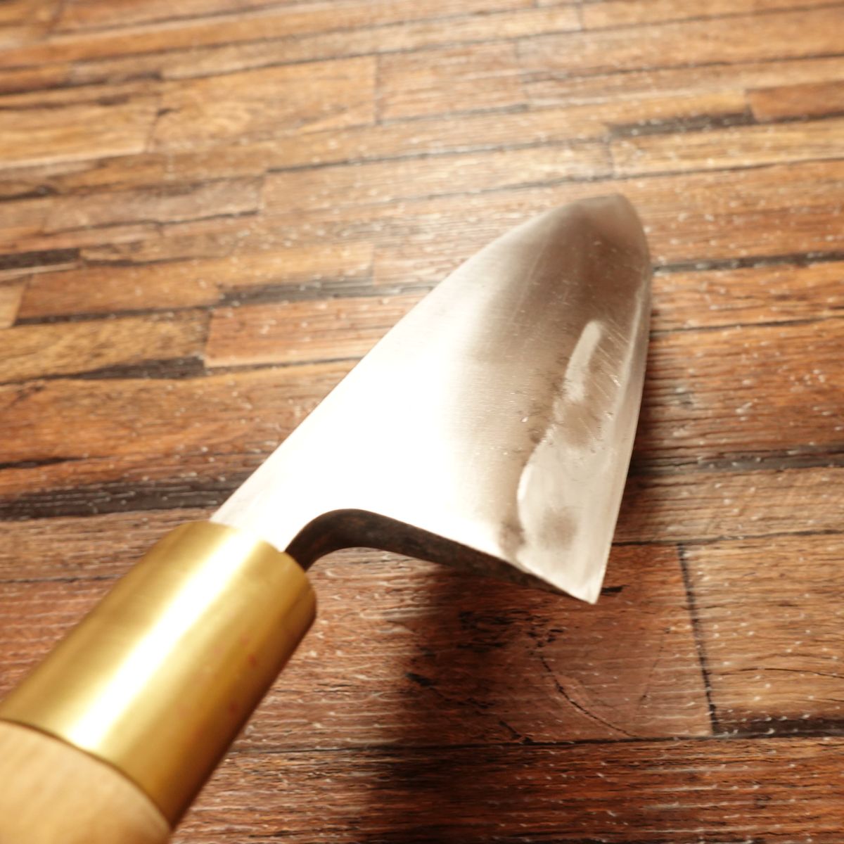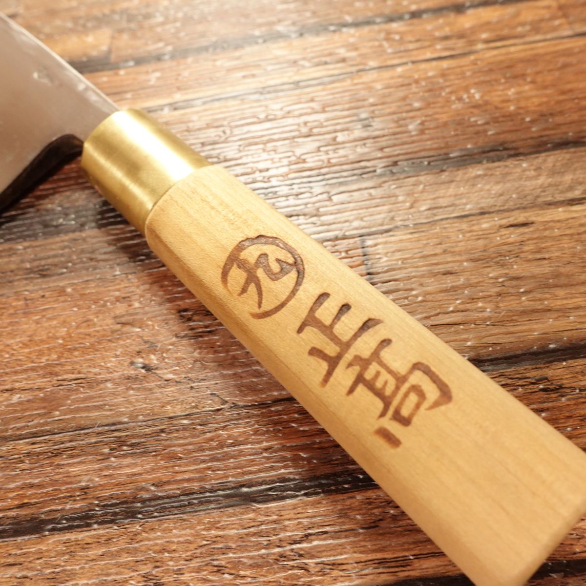 It has a single-bevel Hagane (carbon steel) blade, offering a sharply honed edge and satisfying cutting feel.