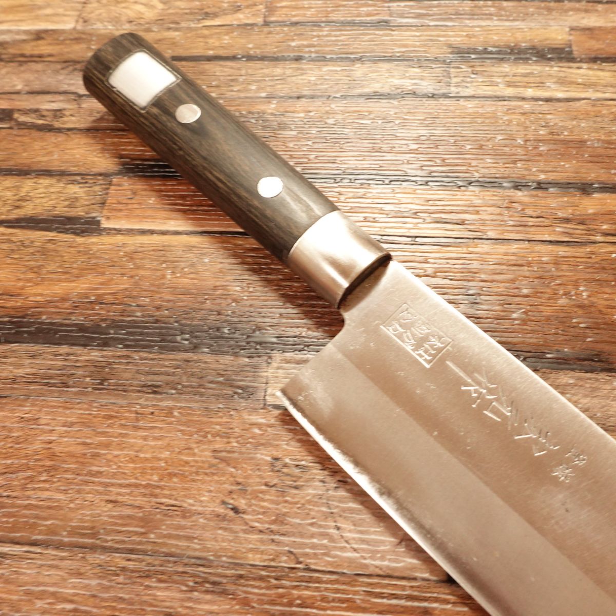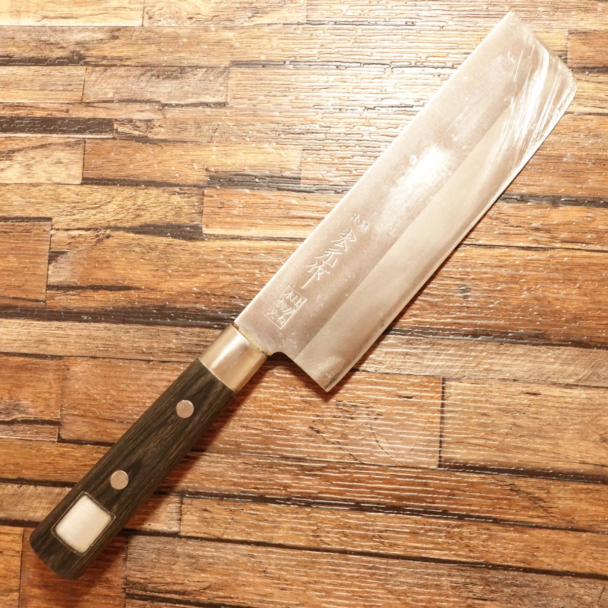 The Nakiri is a traditional Japanese knife made for chopping vegetables and root crops with clean, straight cuts. This double-edged laminated steel blade is easy to handle and maintain. It is a rare, discontinued Hiromoto piece in excellent condition.