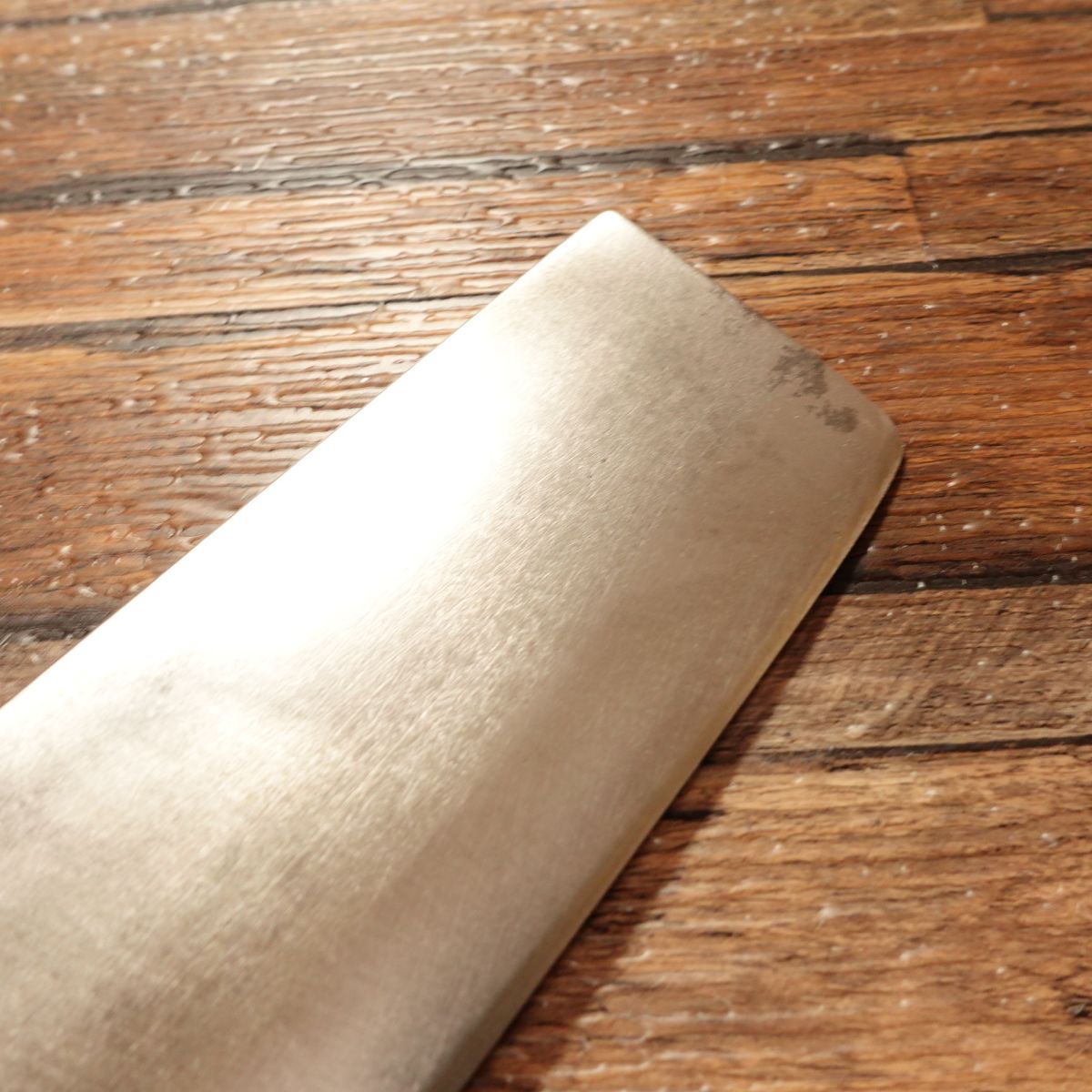 The Nakiri is designed for efficient vegetable cutting. This piece has some natural darkening of the steel, while the edge remains clean and sharp.