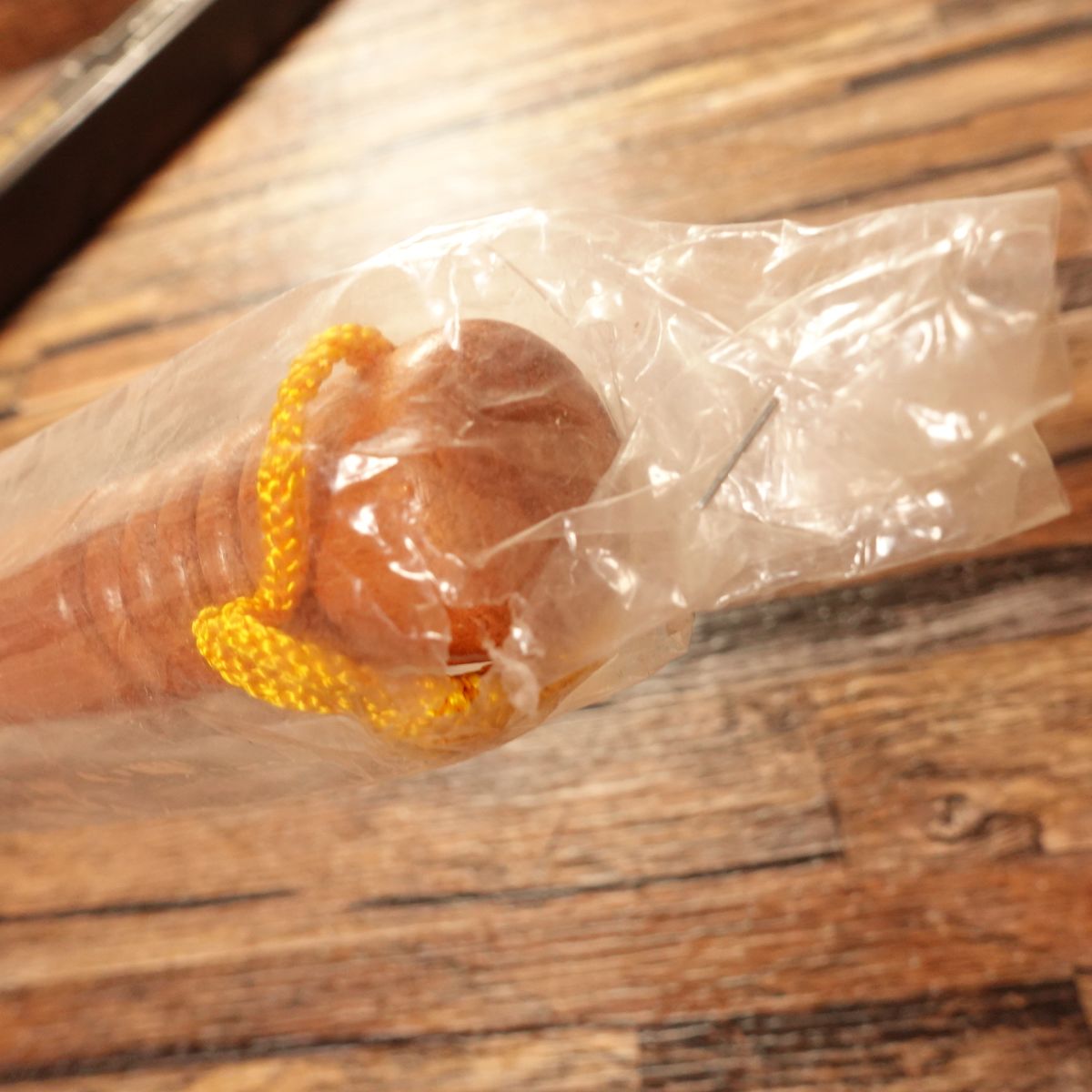 This honing rod is designed for maintaining knife edges. It remains unopened, sealed with staples in its original bag, indicating long-term storage. Some dust and age-related marks are present, but the rod itself is preserved. The listed weight includes packaging and inserts.