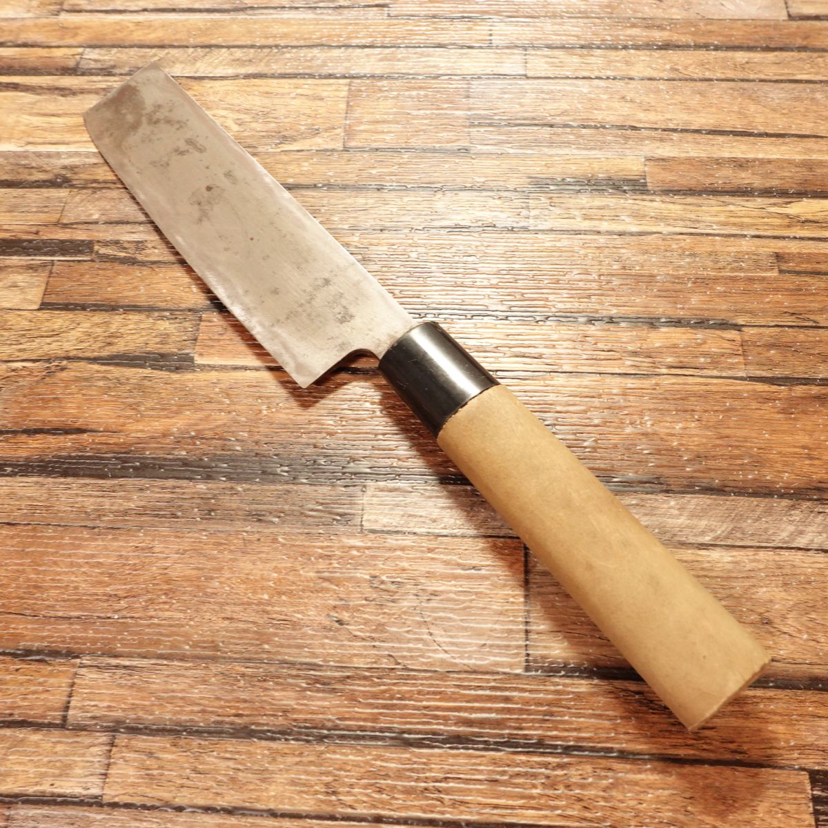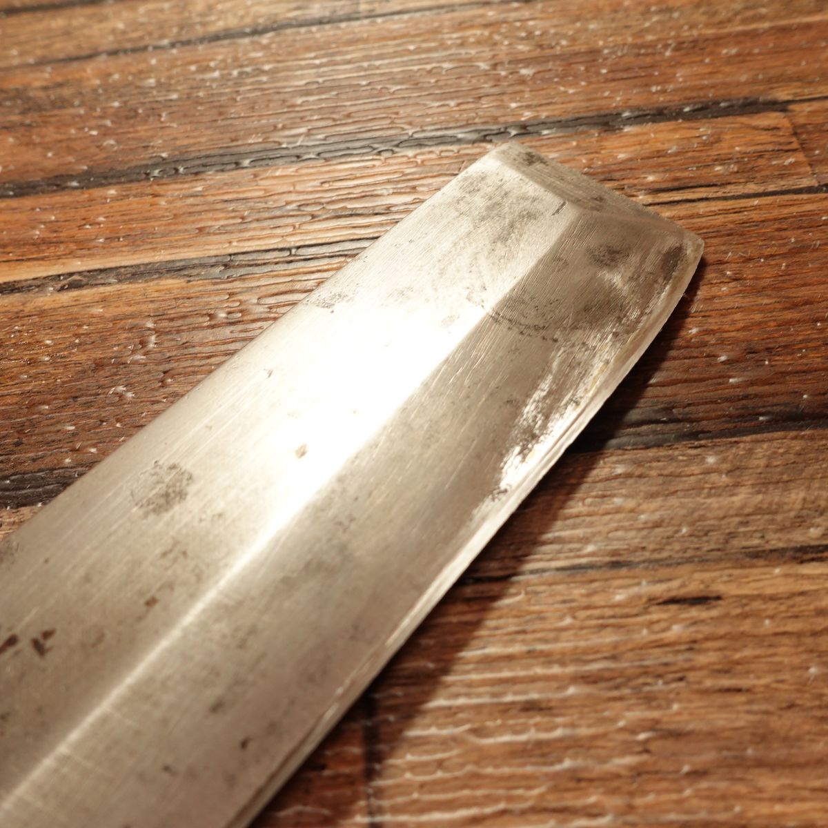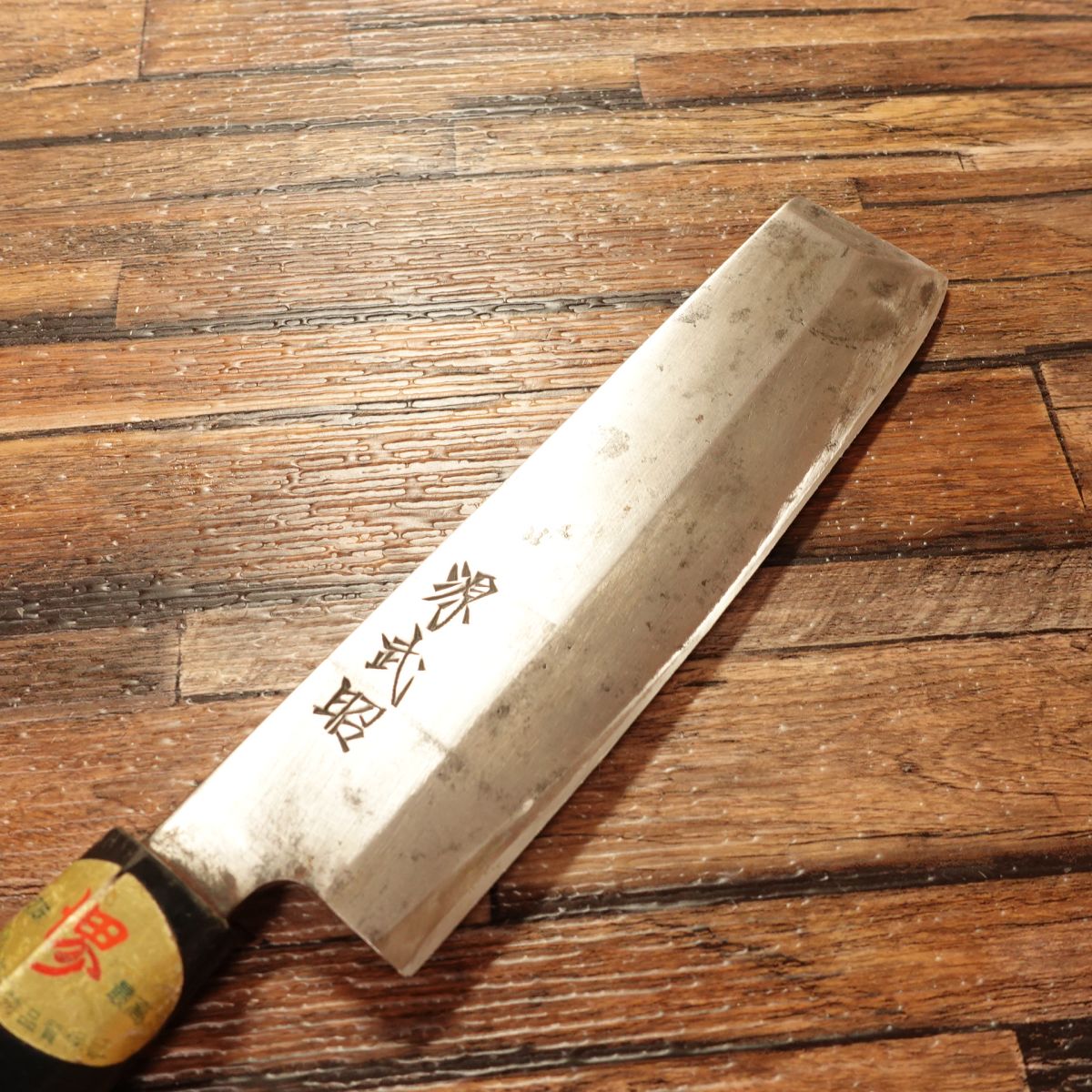 Some natural patina on the carbon steel, while the freshly sharpened edge shows bright steel. Professionally sharpened for immediate use; handle with care on unpacking. Sharpening fee included.