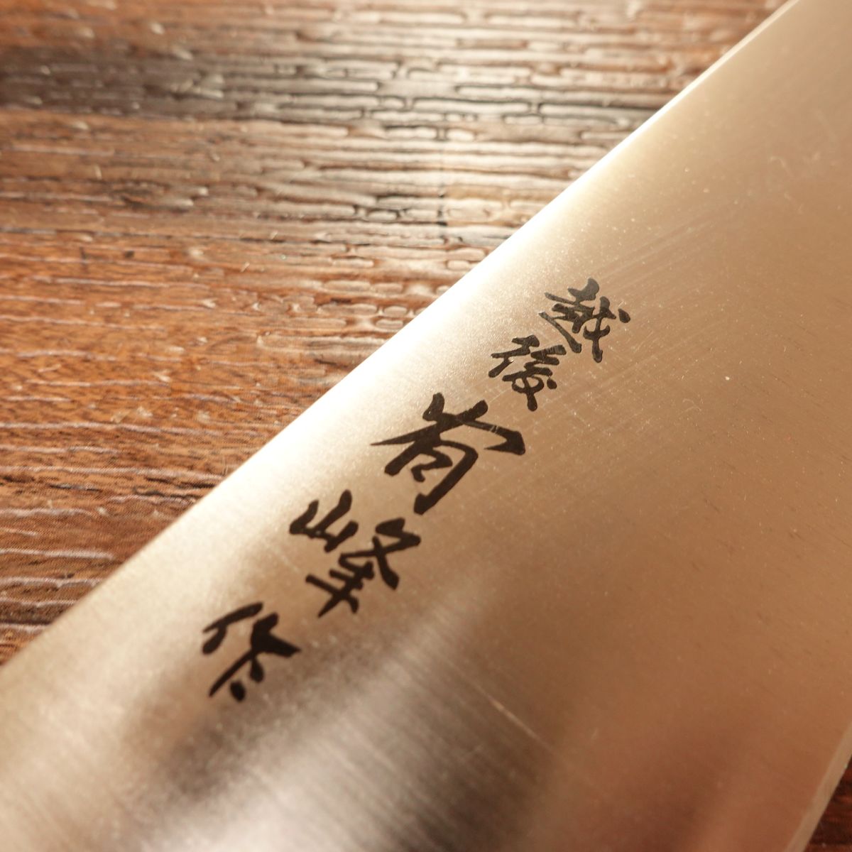It features the inscription “越後有峰作” (Echigo Arimine Saku). This lightweight Gyuto is well suited as a main kitchen knife for daily cooking, from slicing vegetables to trimming meat and fish.