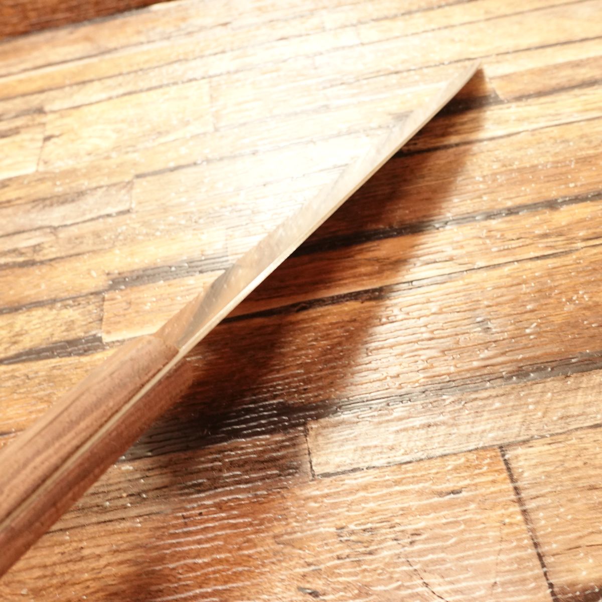 This is a Gyuto knife by Arimine. Gyuto knives are versatile chef’s knives suitable for cutting meat, fish, and vegetables. This is a thin, all-purpose knife in clean condition, offering a light and nimble feel that makes it ideal for everyday use.