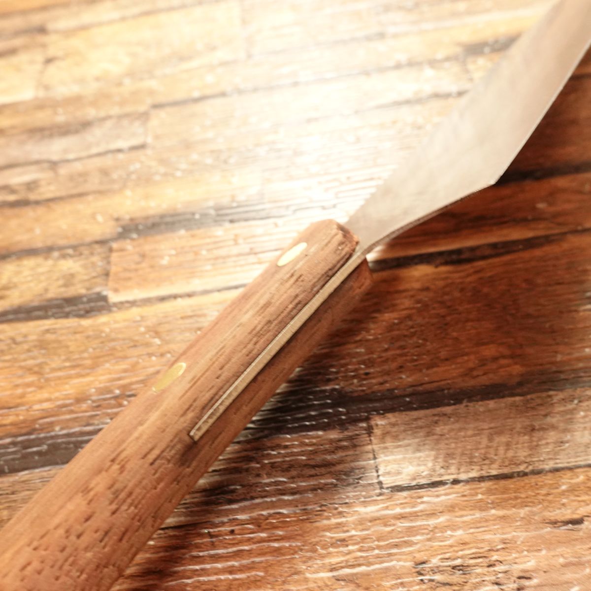 It bears the inscriptions “高級安来ハガネ鋼” (High-Grade Yasuki Hagane Steel) and “HRC57.” This Gyuto is well suited as a main knife for those who enjoy the edge retention and crisp feel of carbon steel.