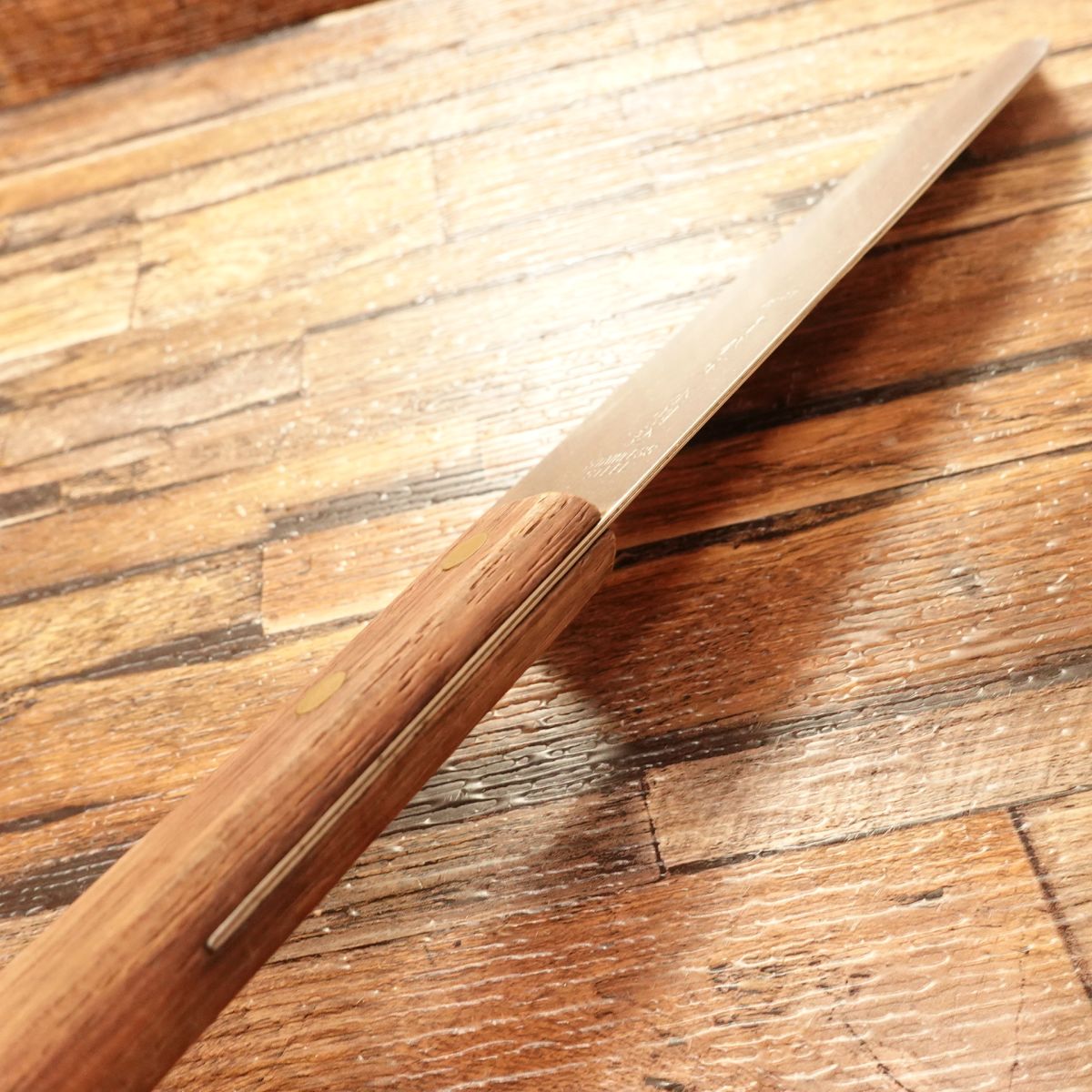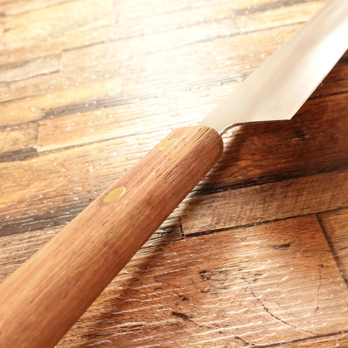 This is a Santoku knife by Chiyotakara. Santoku knives are multi-purpose blades that can be used for meat, fish, and vegetables. On this knife, Hagane steel is sandwiched between stainless steel, combining the rust resistance of stainless with the sharpness of Hagane.
