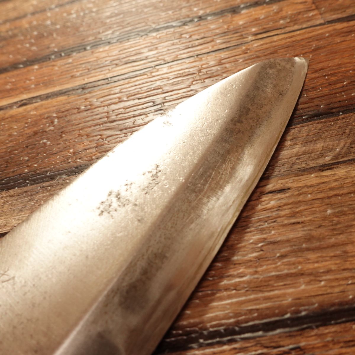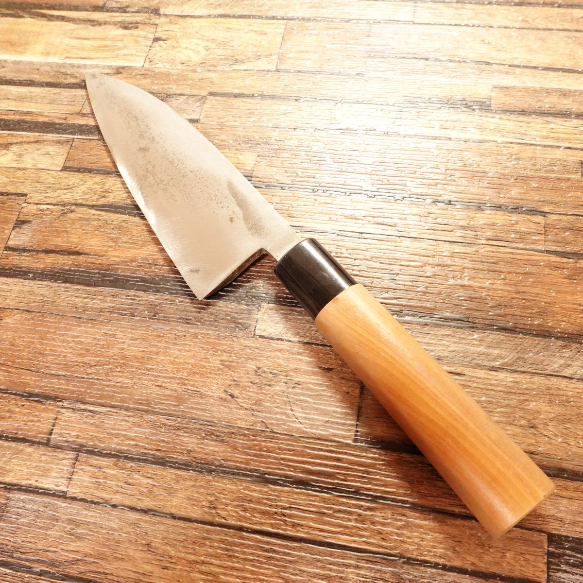 This is a Deba knife by Tadamune. Deba knives are Japanese blades specialized for breaking down fish and cutting through bones. There is some typical darkening from Hagane, but the sharpened edge is bright and silver. The original sticker is still intact, suggesting it has seen relatively light use and careful storage.