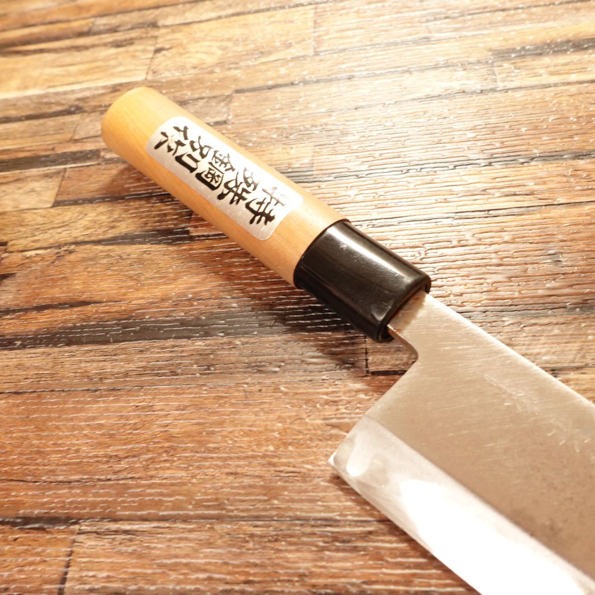It bears the engraving “忠宗作” (Tadamune Saku), and the handle retains its original sticker. This Deba is well suited for users who want a traditional fish-processing knife for filleting and portioning fish for sashimi or sushi, with enough presence to handle bones confidently.