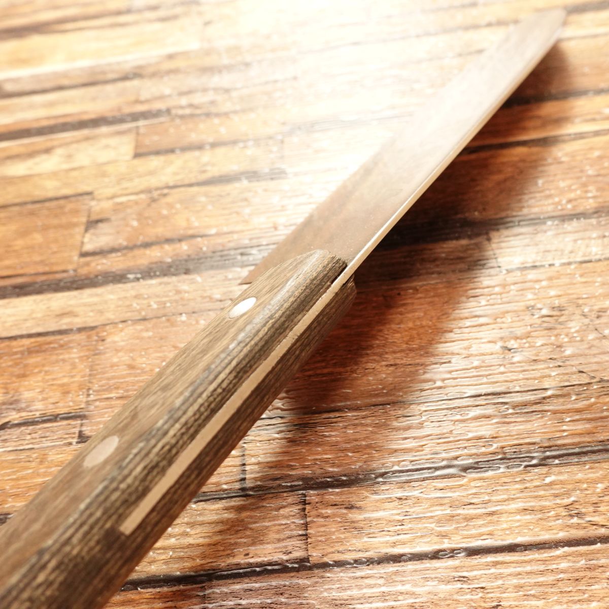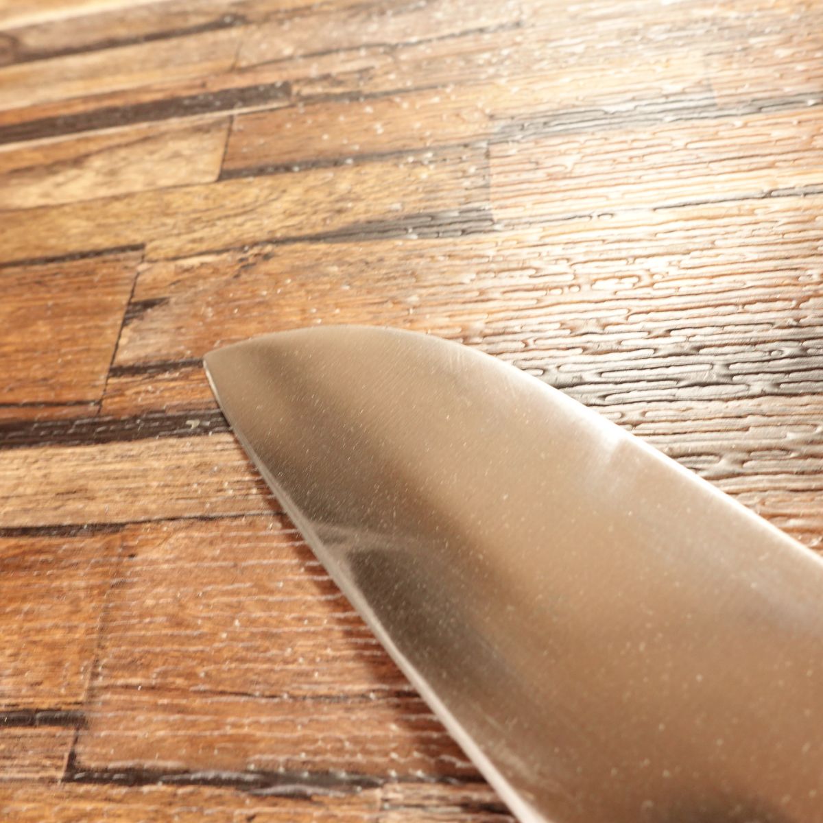 This is a KIYA RUGBY series santoku knife. The santoku is an all-purpose Japanese kitchen knife suitable for meat, fish, and vegetables, and its shape is especially easy to handle at home. This popular RUGBY model from KIYA offers a comfortable feel in the hand and is ready to support many more years of daily cooking.