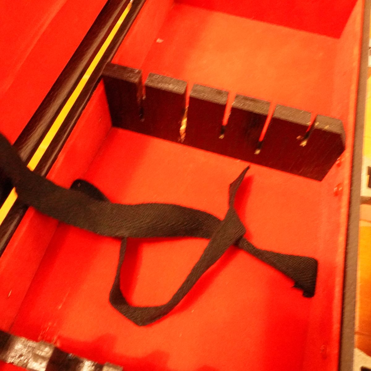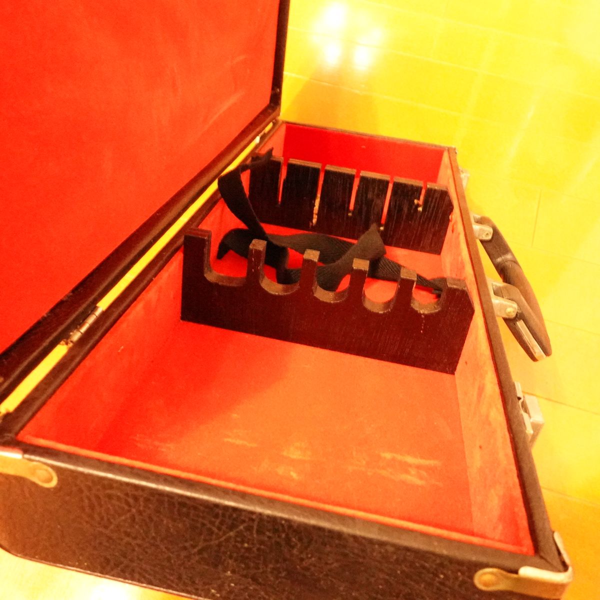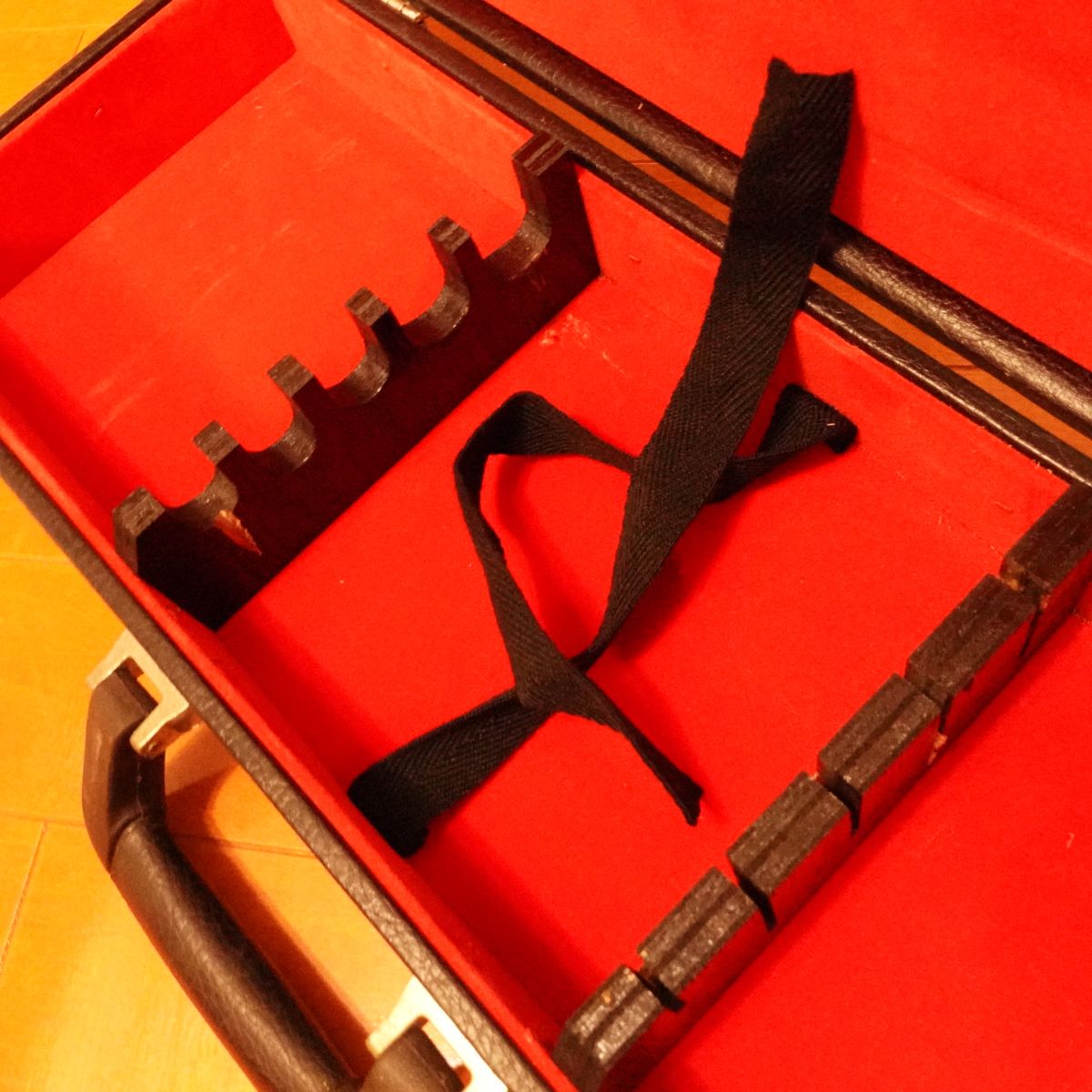 A convenient and stylish storage case for carrying and protecting kitchen knives. This leather-look black case is in excellent condition with minimal wear. Please note the key is not included.