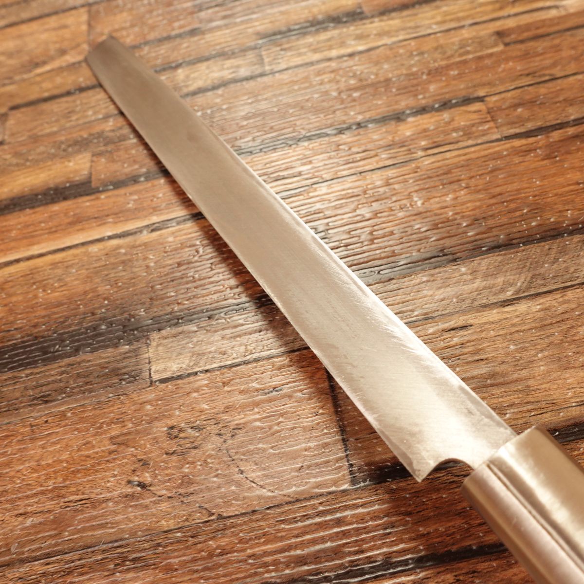 Single-bevel hagane Kanto-style slicer with straight edge for precise sashimi plating cuts.