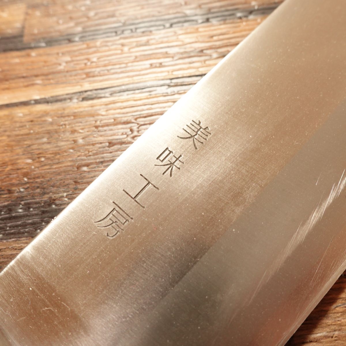 This is a nakiri knife from Bimikobo. The nakiri is a double-bevel Japanese vegetable knife designed for straight, up-and-down cuts, making it very efficient for chopping and slicing vegetables at home. This example shows very little wear and remains in clean condition.