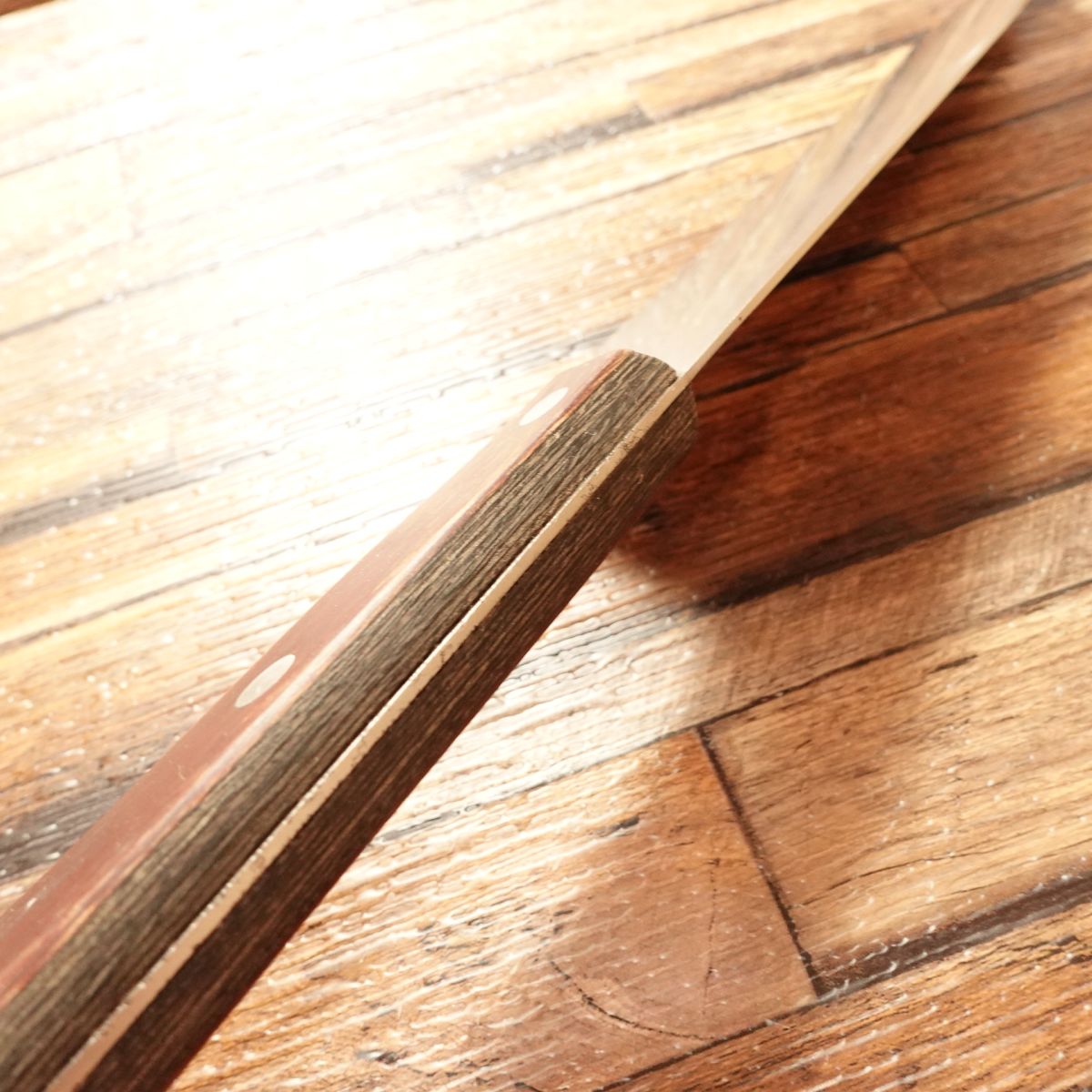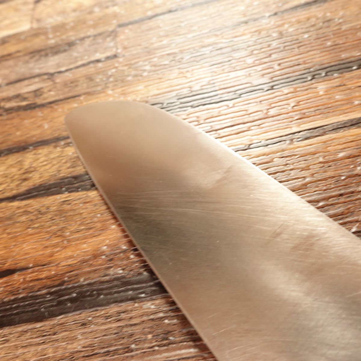 A household favorite for meat, fish, and vegetables. This stainless double-bevel Santoku is notably thin—about 1mm at the spine—for light, low-resistance cutting.