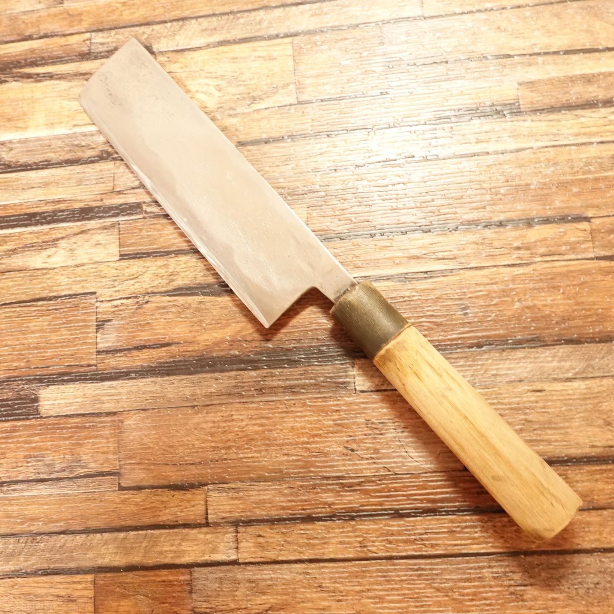 Double-bevel hagane Nakiri with water-buffalo handle and nashiji texture. Classic look with sharp, responsive edge.