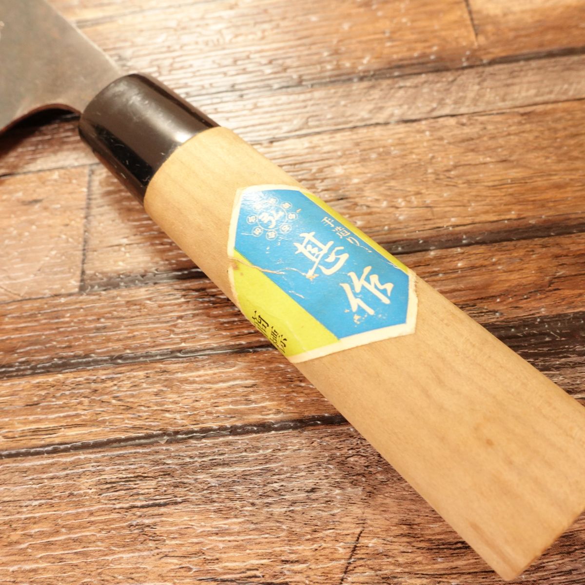 This is a Nakiri knife by Jinsaku. Nakiri knives are double-bevel Japanese vegetable knives with a straight edge, specialized for chopping and slicing vegetables. This piece appears to have been stored with almost no use; the handle still retains its original sticker. The kuro-uchi area shows some storage-related grime and minor rust, but overall it is a clean knife.