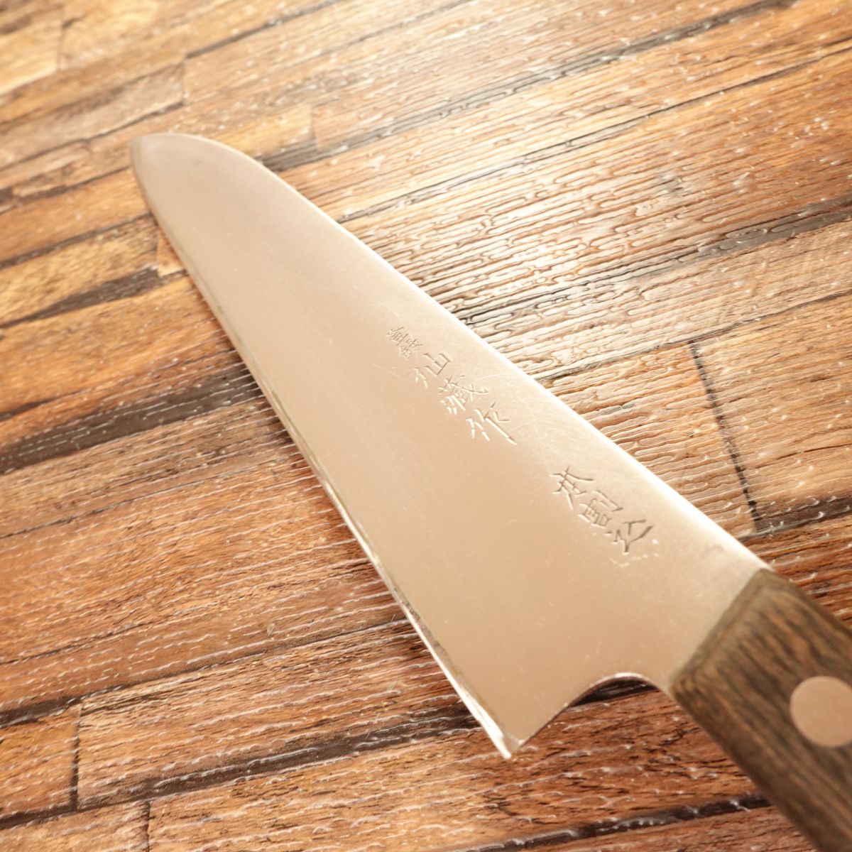 It features the engravings “登録” (Registered), “仙蔵作” (Senzou Saku), and “本割込” (Honwarikomi). This Gyuto is well suited to cooks who like a straighter edge for efficient chopping and slicing, especially for large quantities of vegetables or boneless meats.