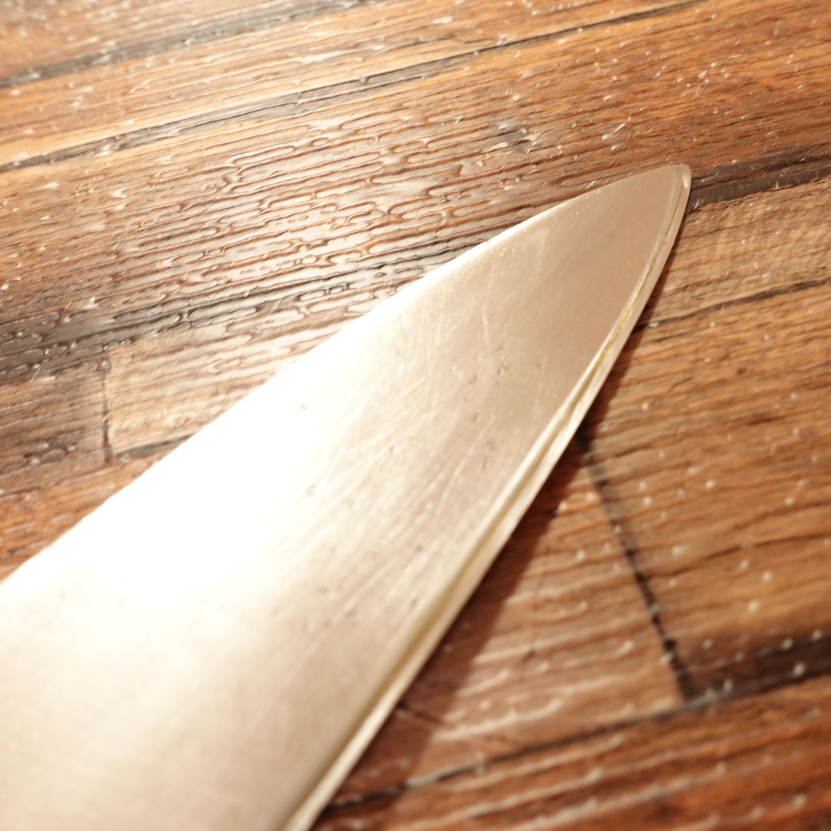 This is a Gyuto knife by Sadaaki. Gyuto knives are Western-style chef’s knives suitable for a broad range of ingredients including meat, fish, and vegetables. There are some light hammer marks along the spine, but they do not affect use; the price has been adjusted slightly, making it a good value if this does not bother you.