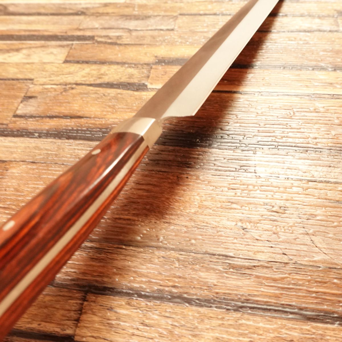 Single-bevel stainless yanagiba for sashimi; factory edge preserved (no added sharpening) and elegant tiny rivets on the handle.