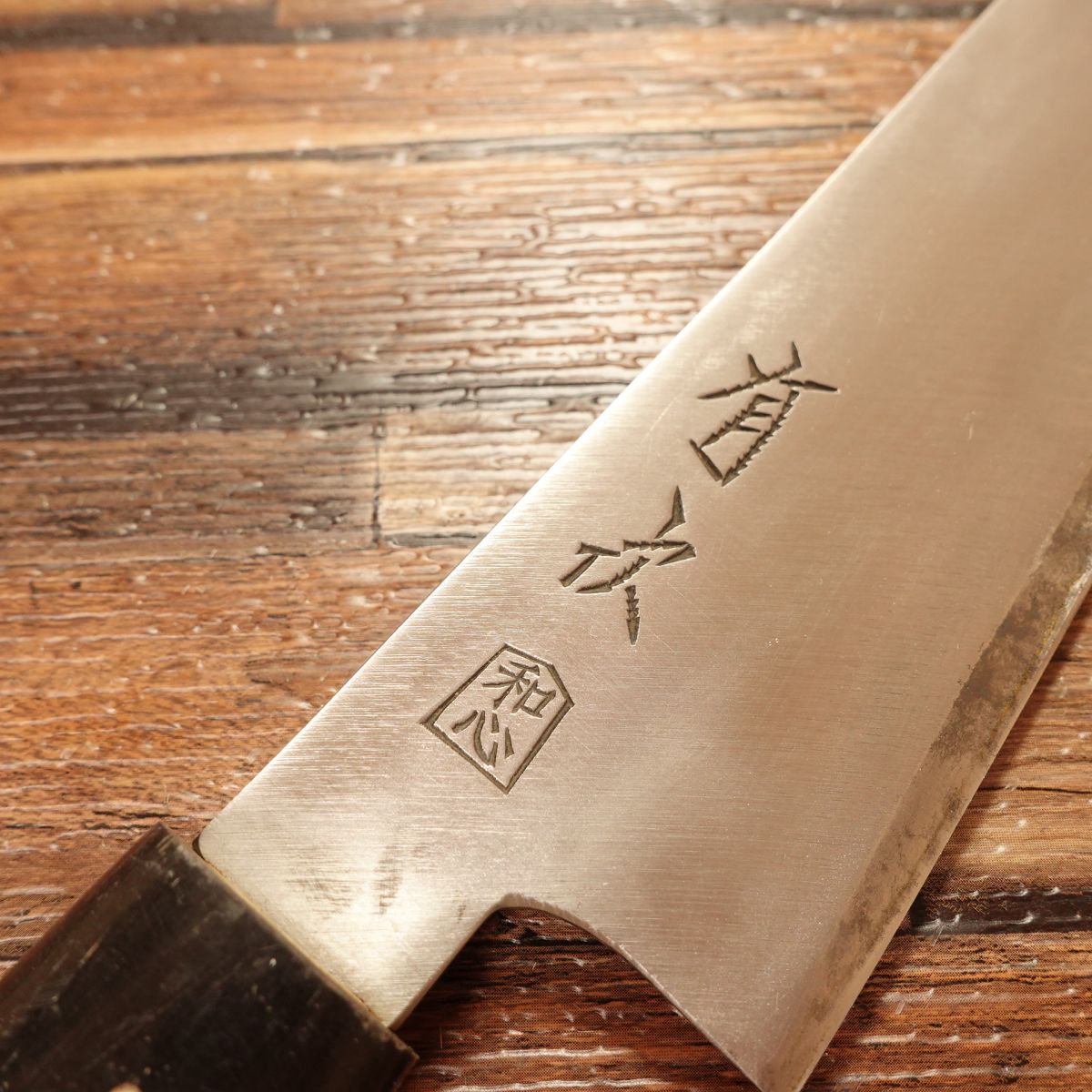 Double-bevel laminated construction with stainless cladding; very light use overall. Minor patina on the core steel from storage; bright edge from sharpening. Some removed name etching remains faintly visible.