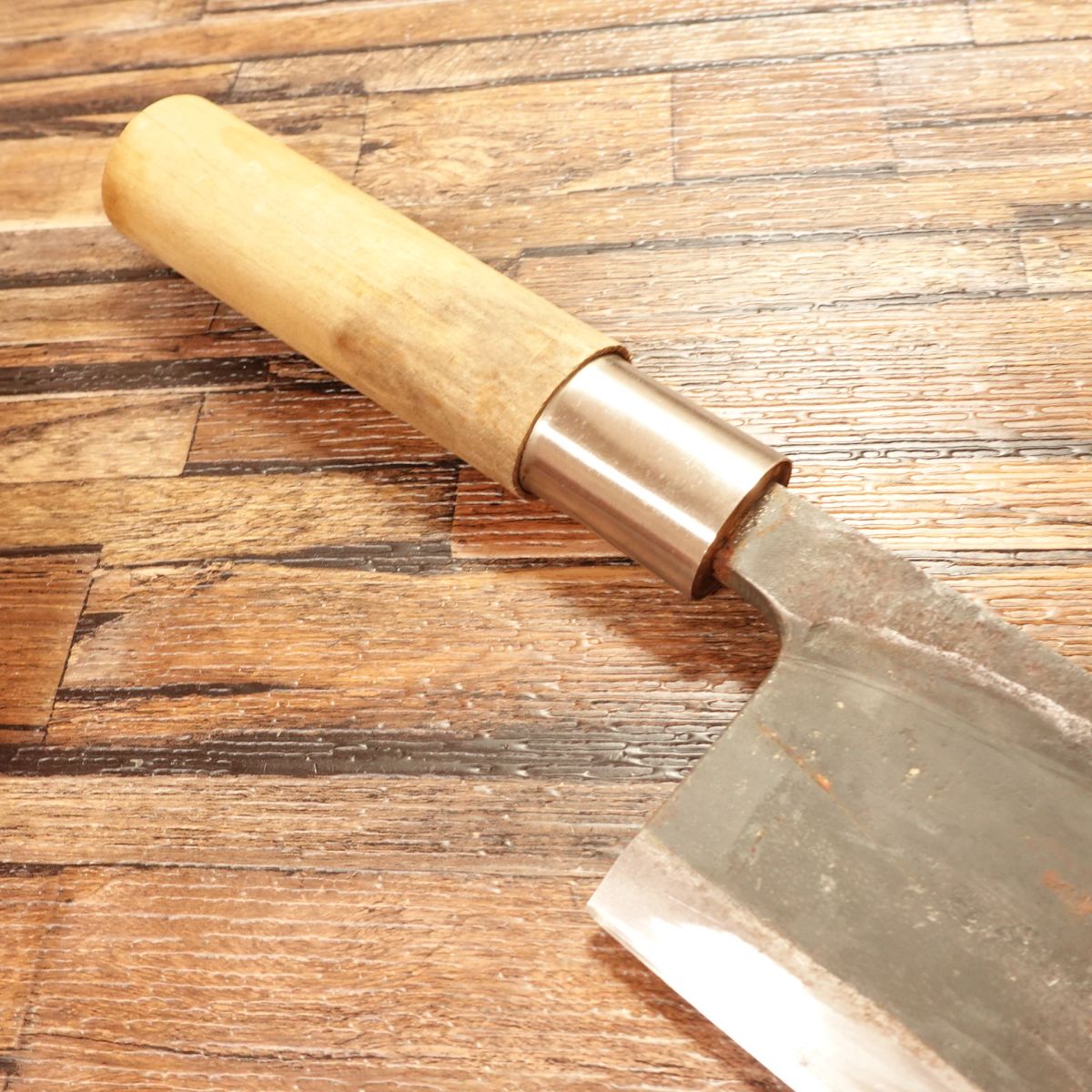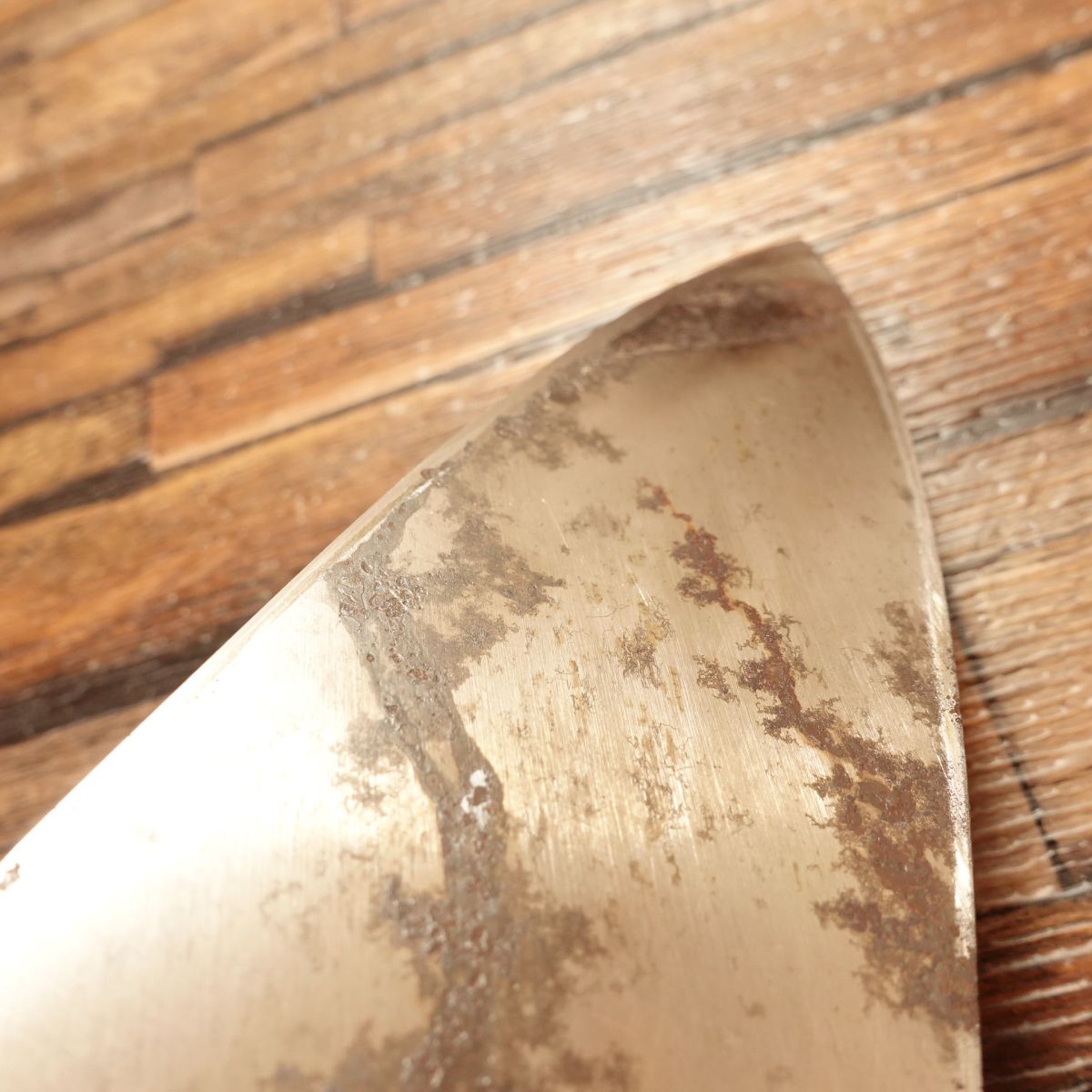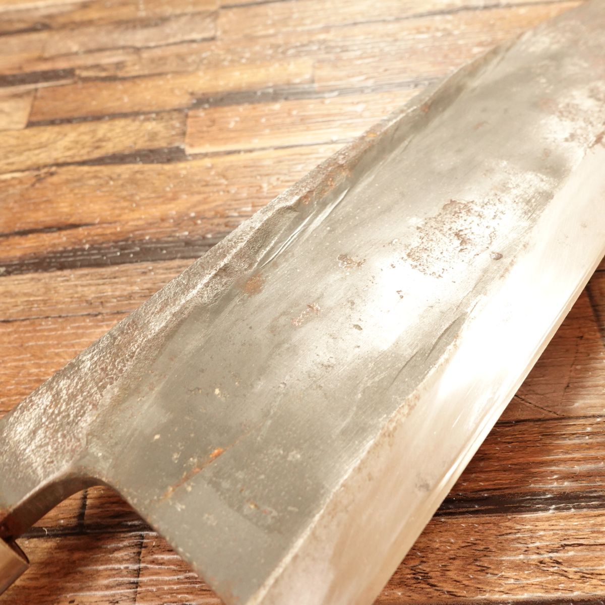 Large single-bevel hagane Deba with striking black-forged texture and an unusual spine-relieved/weight-reduced profile near the back. Very long blade for big fish work.