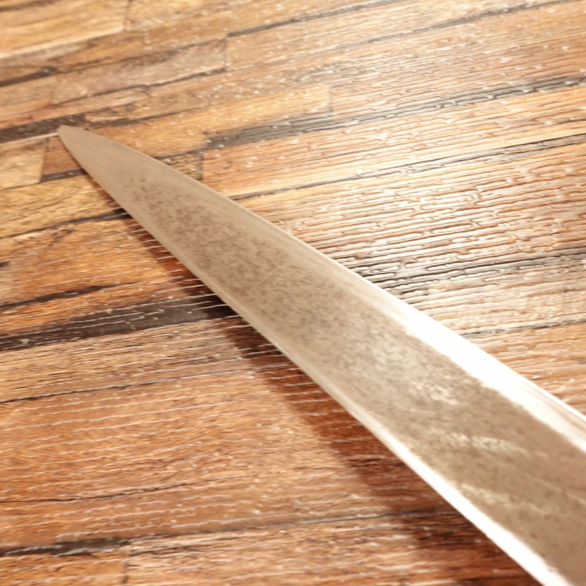 Single-bevel hagane yanagiba for pull-slice sashimi. Tip left slightly rounded as found; can be pointed with a light touch if preferred. Well maintained and ready for use.