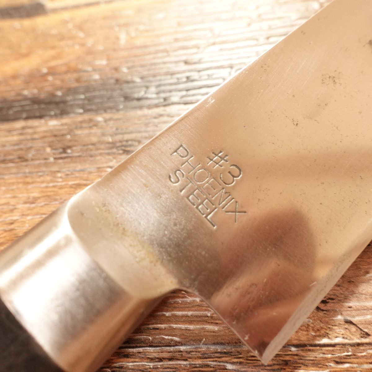 It features the Izutsuki Kiya logo along with markings such as “木屋” (Kiya), “#3,” and “Phoenix Steel.” This Gyuto is a good all-rounder for daily cooking, combining a polished finish with the lively cutting sensation of carbon steel.