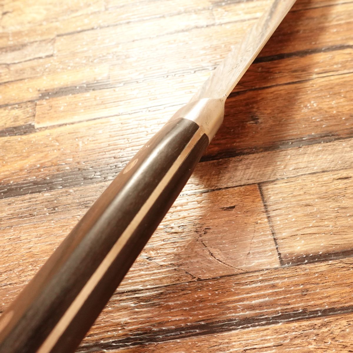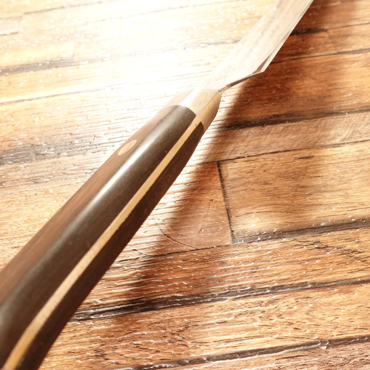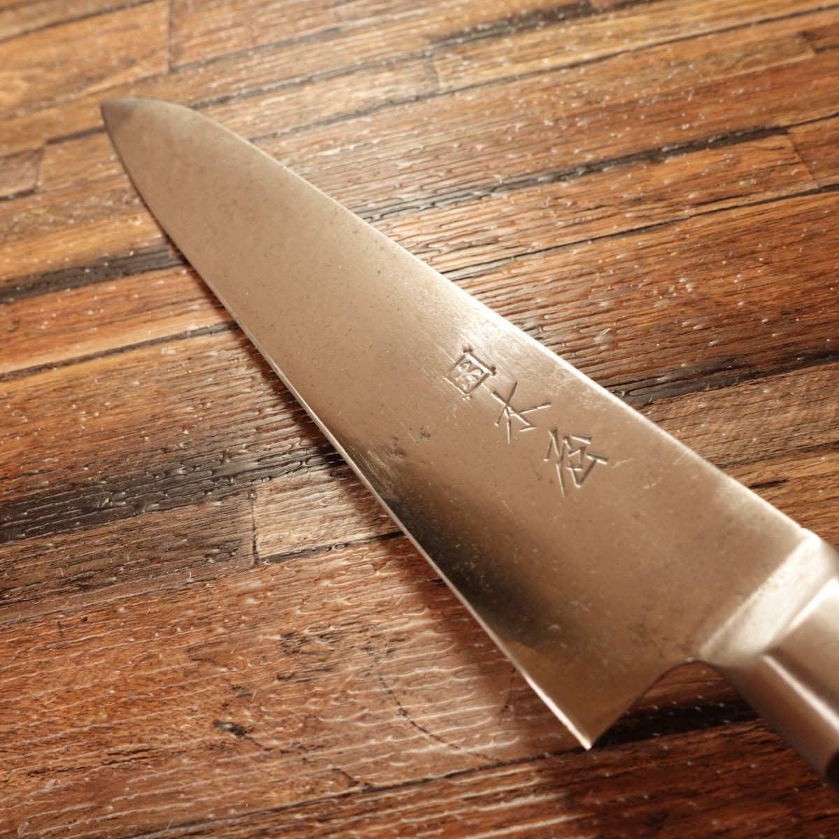 This is a Gyuto knife by Izutsuki Kiya. Gyuto knives are Western-style chef’s knives that can be used universally for meat, fish, and vegetables. This piece appears to have been treated with care and used gently. The blade has been finished to a semi-mirror polish, giving it a refined appearance.
