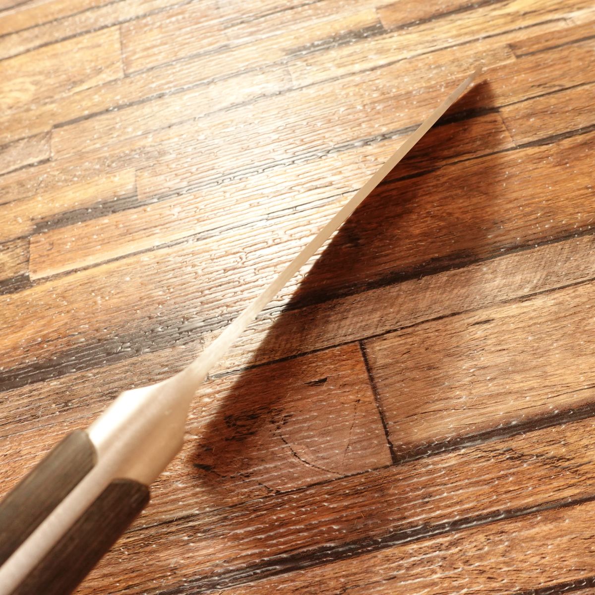 This is a Western Deba knife by Glestain. Western Deba knives combine the versatility of a Santoku or Gyuto with the extra blade thickness needed to handle fish processing, making them highly versatile all-purpose knives. This piece appears to have seen very little use. It was ground with a strong bias toward one side, around 9:1 to 8:2, and has been finished in that style. One side of the blade features Glestain’s characteristic dimples to help ingredients release easily.