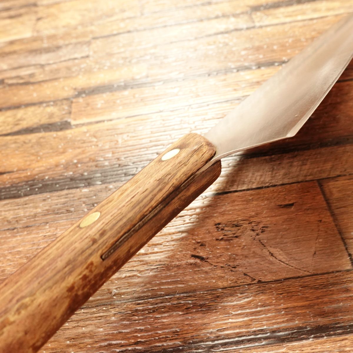This is a Santoku knife made from high-grade Yasuki Hagane steel. Santoku knives are versatile all-purpose knives suitable for meat, fish, and vegetables. This knife has a relatively thin blade and is easy to handle on the cutting board.
