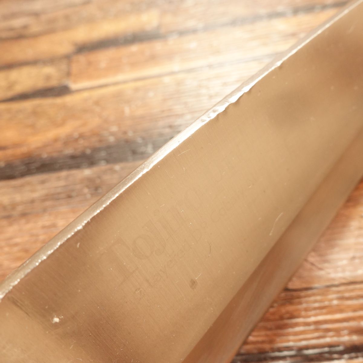 Single-bevel stainless Deba—sanitary and easy to maintain—with asymmetrical handle for secure grip. Minor spine marks noted.