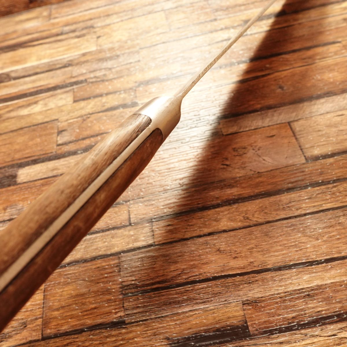 This is another Gyuto knife by Sakai Ichimonji Mitsuhide. Gyuto knives are versatile Western-style chef’s knives that can handle a wide range of ingredients, including meat and vegetables. This piece shows some typical darkening from carbon steel, but the sharpened edge is a clean, bright silver. The price has been adjusted to reflect the cosmetic patina, making it a good option for those who value performance over appearance.