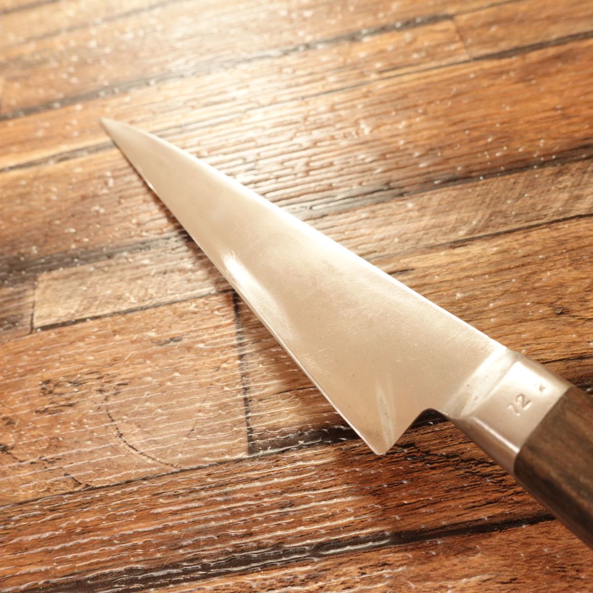 This is another petty knife by Misono. It is a compact and easy-to-handle Western-style knife, well suited for use as a fruit knife and for fine cutting tasks. The blade had been maintained with a straight edge and has been finished that way, allowing for sharp, direct contact with the board and easy, straight cuts.