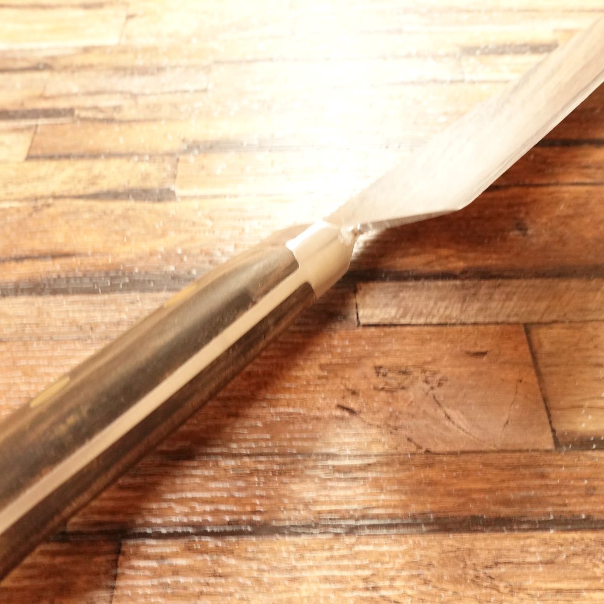 This is a Gyuto knife by Misono. Gyuto knives are Western-style chef’s knives suitable for cutting a wide variety of ingredients such as meat, fish, and vegetables. This is a large stainless Gyuto that appears to have been carefully used. It has a moderate weight that gives a stable feel in use.