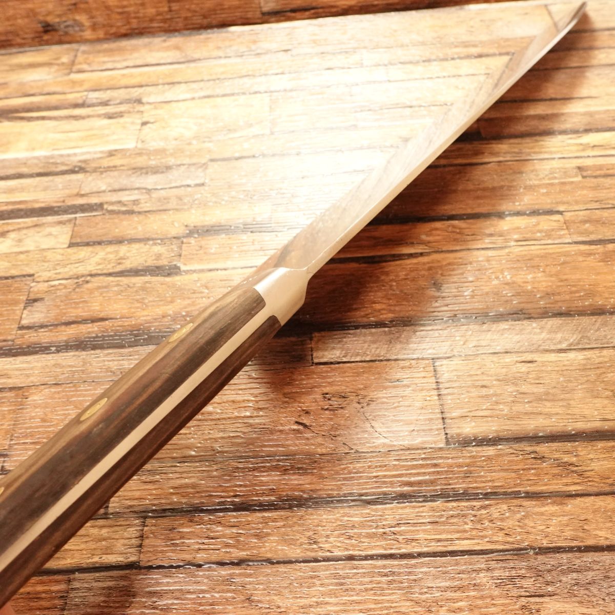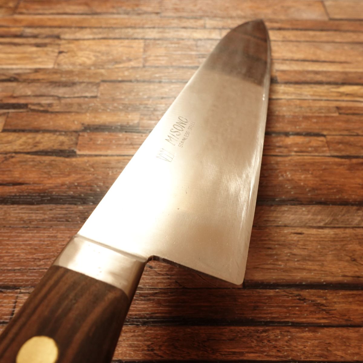 It bears markings and logos such as “MISONO” and “Stainless Steel.” This large Gyuto is ideal for users who prefer a full-size chef’s knife for high-volume prep, such as breaking down large vegetables or portioning meat.