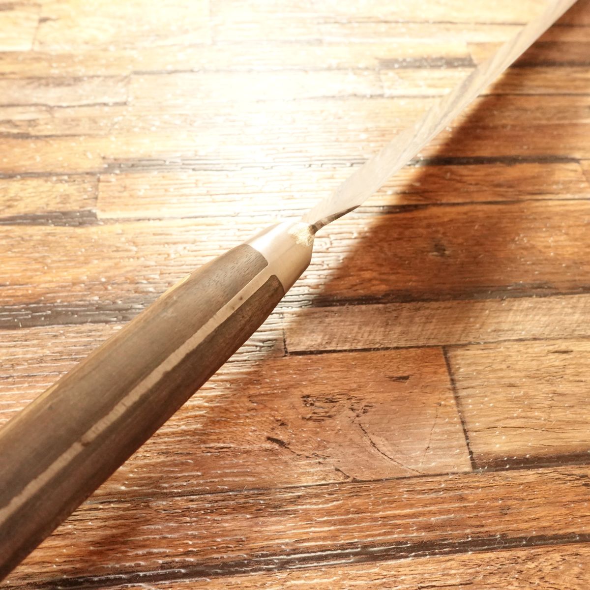 This is a Sujihiki knife by Misono. It is a slim slicer type, ideal for slicing roasts, ham, and similar items into thin, attractive slices. This Swedish steel model has been carefully used and maintained and is ready for more work in the kitchen.