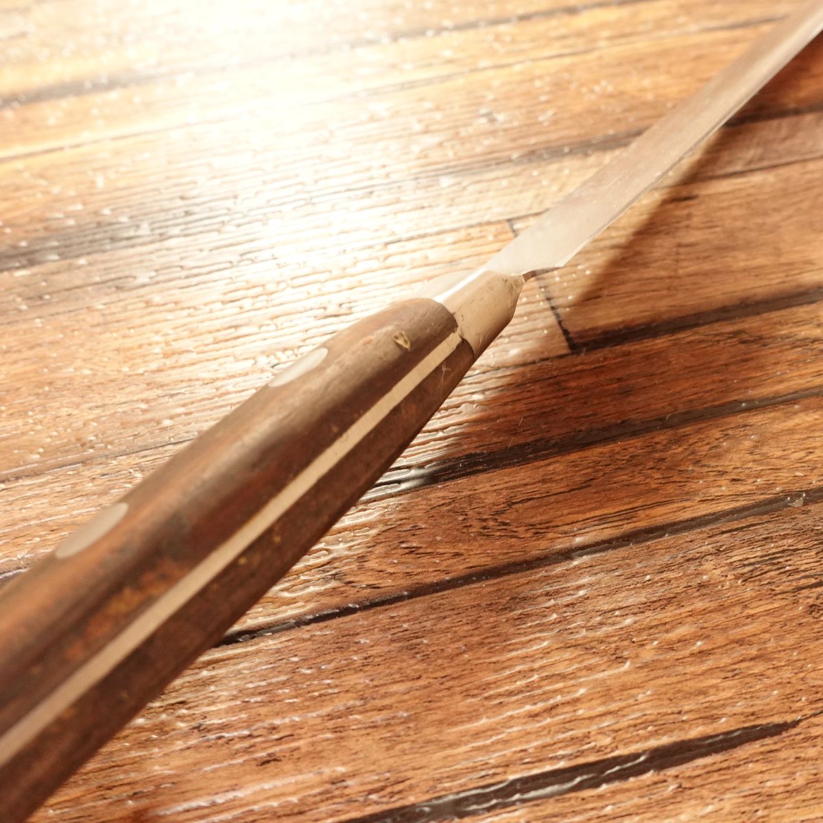 This is a Sujihiki knife by Misono. It is a slim slicer type, suitable for slicing meat or fish. The blade had been sharpened with a slight single-bevel bias, around 7:3, and has been finished with that edge, making it particularly comfortable for draw cuts. It does not flex like a sole knife, and appears to have been carefully used and maintained.