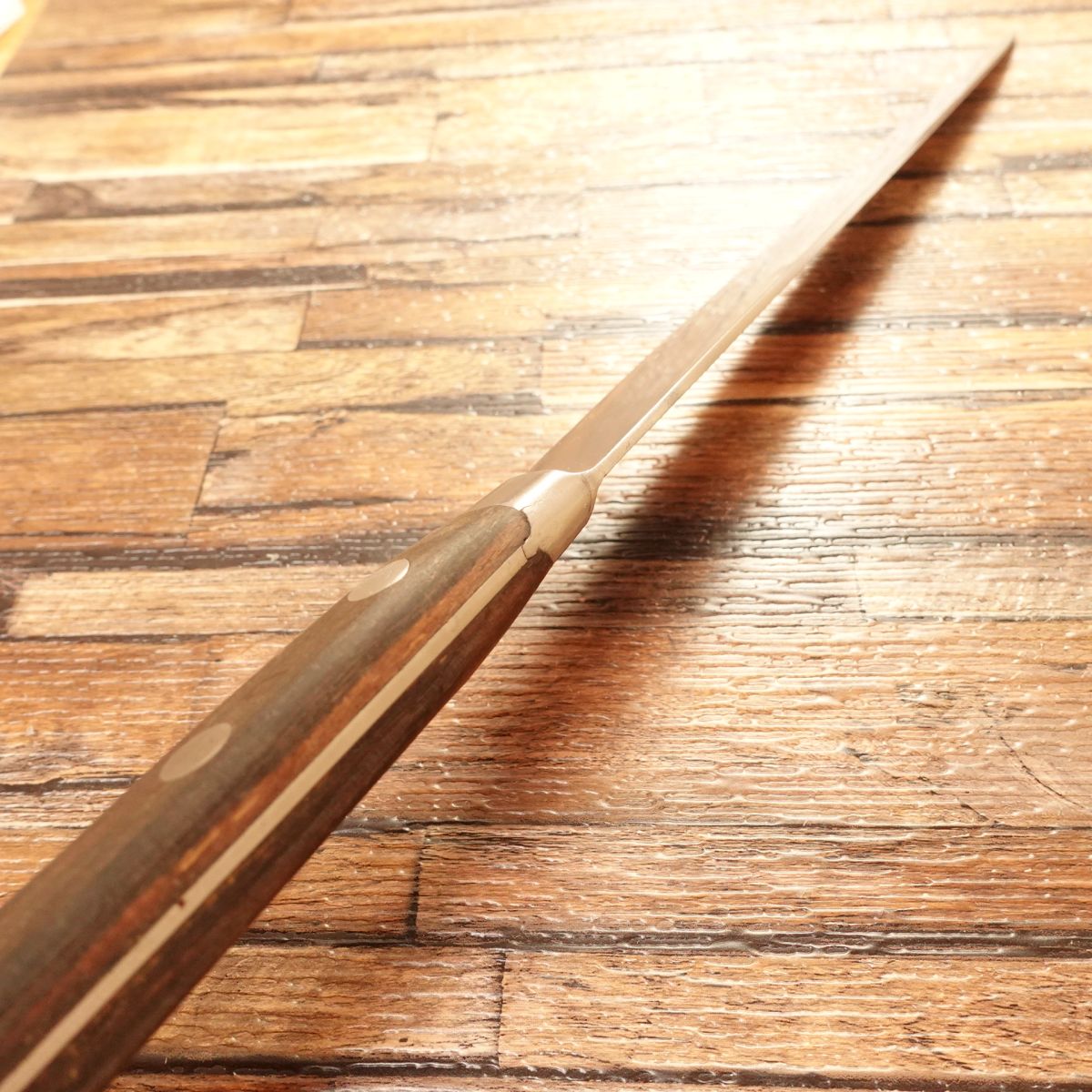 It bears markings and logos such as “MISONO” and “特殊鋼” (Special Steel). This Sujihiki is ideal for slicing steaks, roasts, and fillets with clean, controlled strokes, making it useful both in home kitchens and in professional settings.
