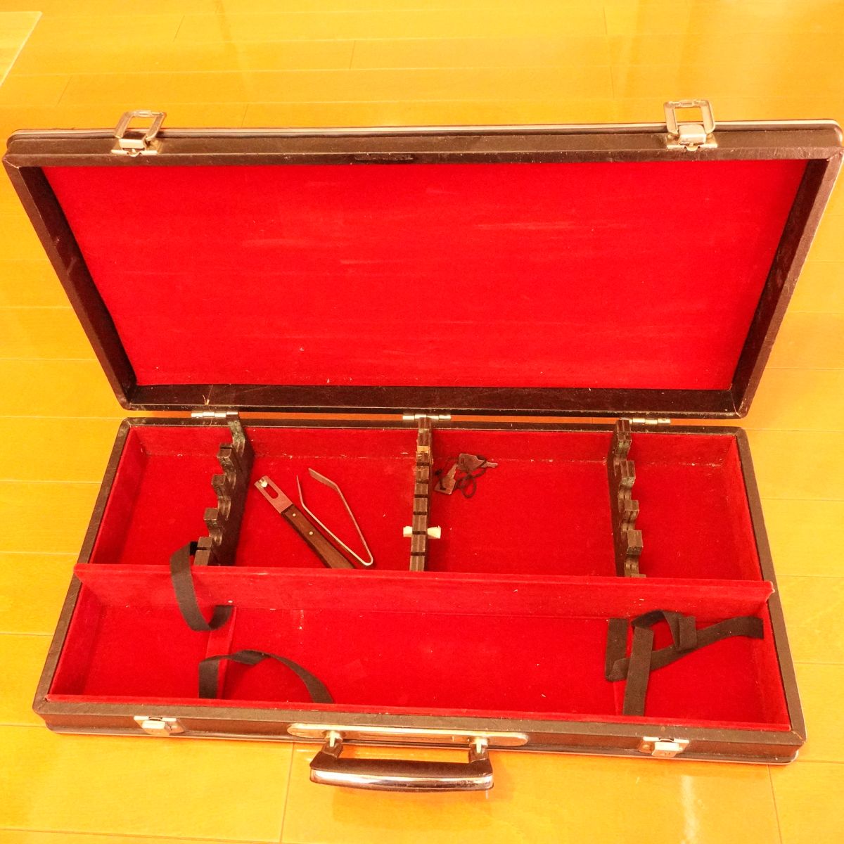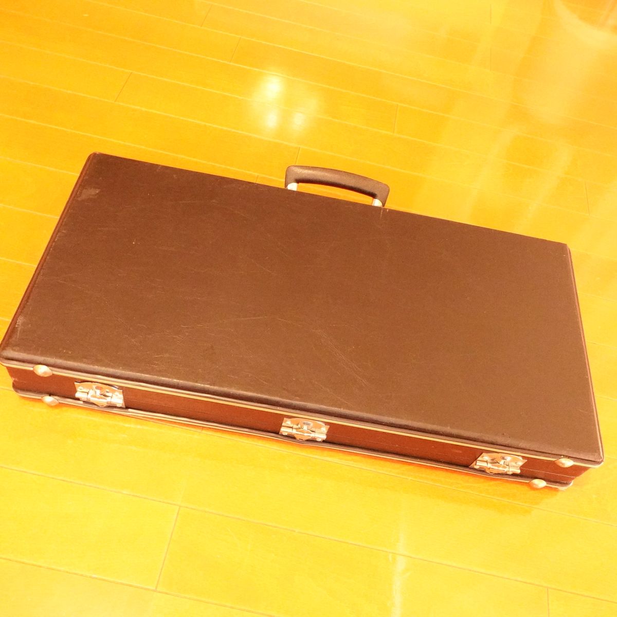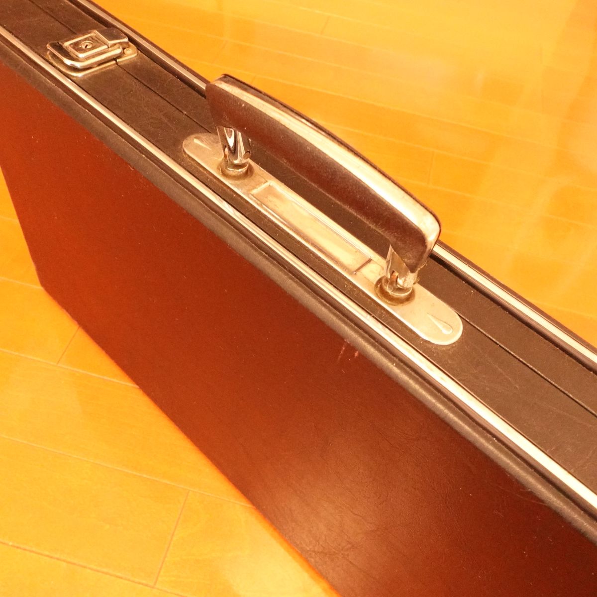 This is a large, black hard case for kitchen knives. It is a lockable hard-type knife case that allows you to store and carry multiple knives safely. Many models of this style include internal dividers and securing straps, making it convenient for traveling chefs, catering, and camping. The listed dimensions exclude the handle.